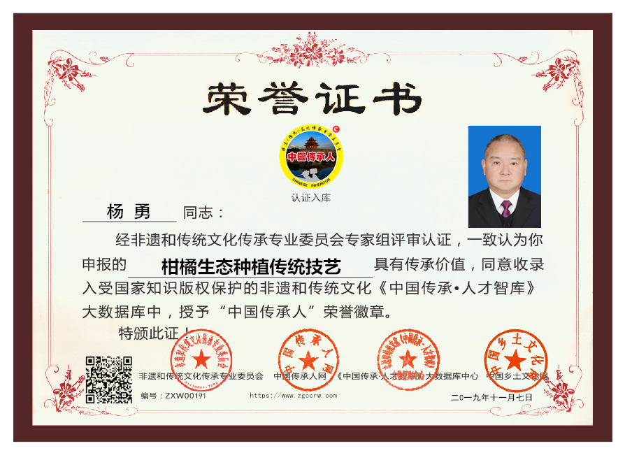 191位“柑橘生态种植传统技艺”传承人杨勇成功入库《传承人才智库》
