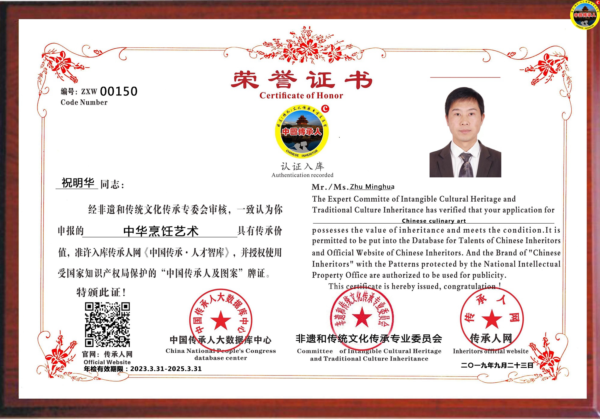 传承人网:2019年9月23日,经非遗和传统文化传承专委会召开专家组评审会议,一致认同四川省凉山州祝明华同志申报的“中华烹饪艺术”具有非遗和传统文化传承价值,并向传承人网《中国传承·人才智库》推荐入库。经审核完全符合入库标准,准许入库,授予受国家知识版权保护的非遗和传统文化《中国传承·人才智库》认证入库荣誉证书和“中国传承人”荣誉徽章。