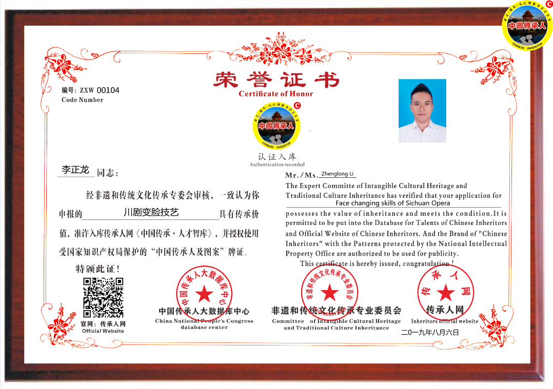 传承人网:2019年8月6日,经中国传承人大数据库中心非遗和传统文化传承专业委员会审核,认为广东省珠海市李正龙同志申报的“川剧变脸技艺”具有传承价值,符合申报条件,准许入库传承人网《中国传承·人才智库》,并授权使用受知识产权保护的“中国传承人及图”牌证。