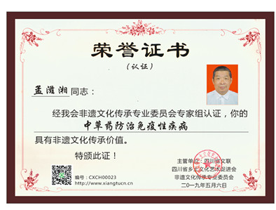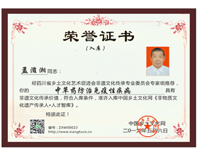 2019年5月9日,经四川乡促会非遗文化传承专委会召开专家组评审会议,一致认同孟滋湘同志申报的“
