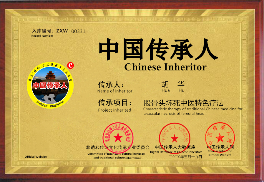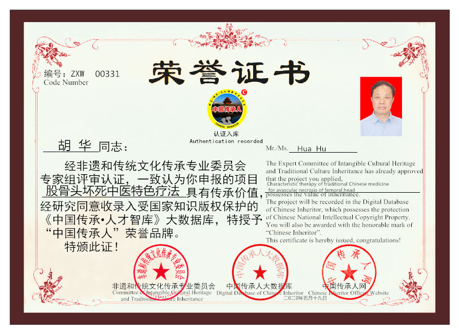 传承人网:2020年5月19日,经非遗和传统文化传承专委会召开专家组评审会议,一致认同四川省泸县胡华同志申报的“股骨头坏死中医特色疗法”具有非遗和传统文化传承价值,并向中国传承人网《中国传承·人才智库》推荐入库。经审核完全符合入库标准,准许入库,授予受国家知识版权保护的非遗和传统文化《中国传承·人才智库》认证入库荣誉证书和“中国传承人”荣誉牌证。