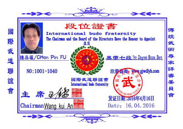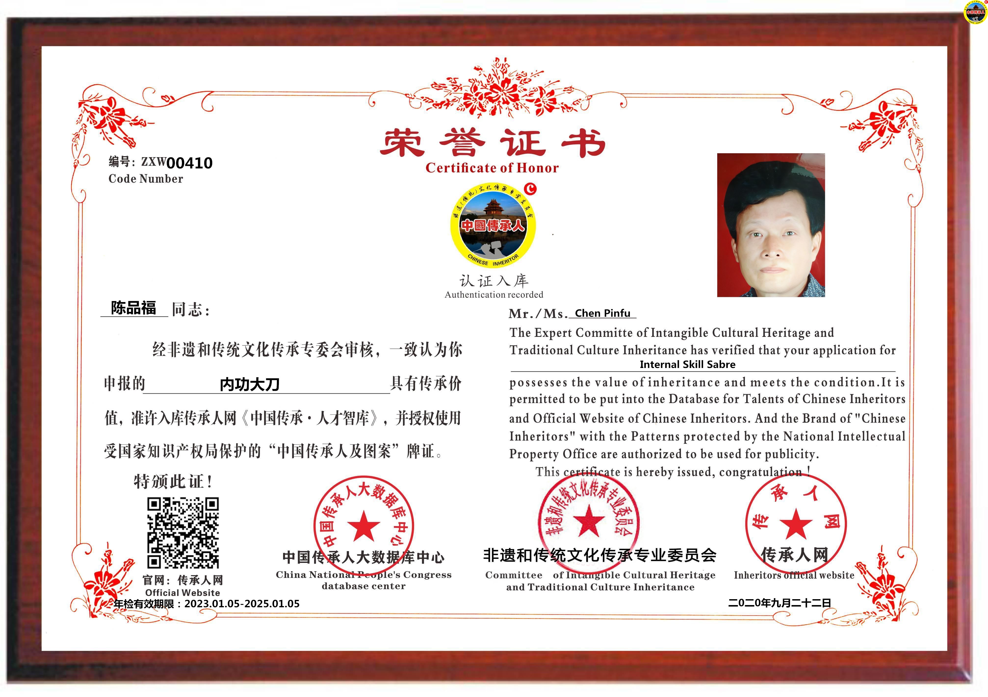传承人网:2020年09月22日,经非遗和传统文化传承专委会召开专家组评审会议,一致认同浙江省磐安县陈品福同志申报的“内功大刀具有传承价值,符合申报条件,准许入库传承人网《中国传承·人才智库》,并授权使用受知识产权保护的“中国传承人及图”牌证。