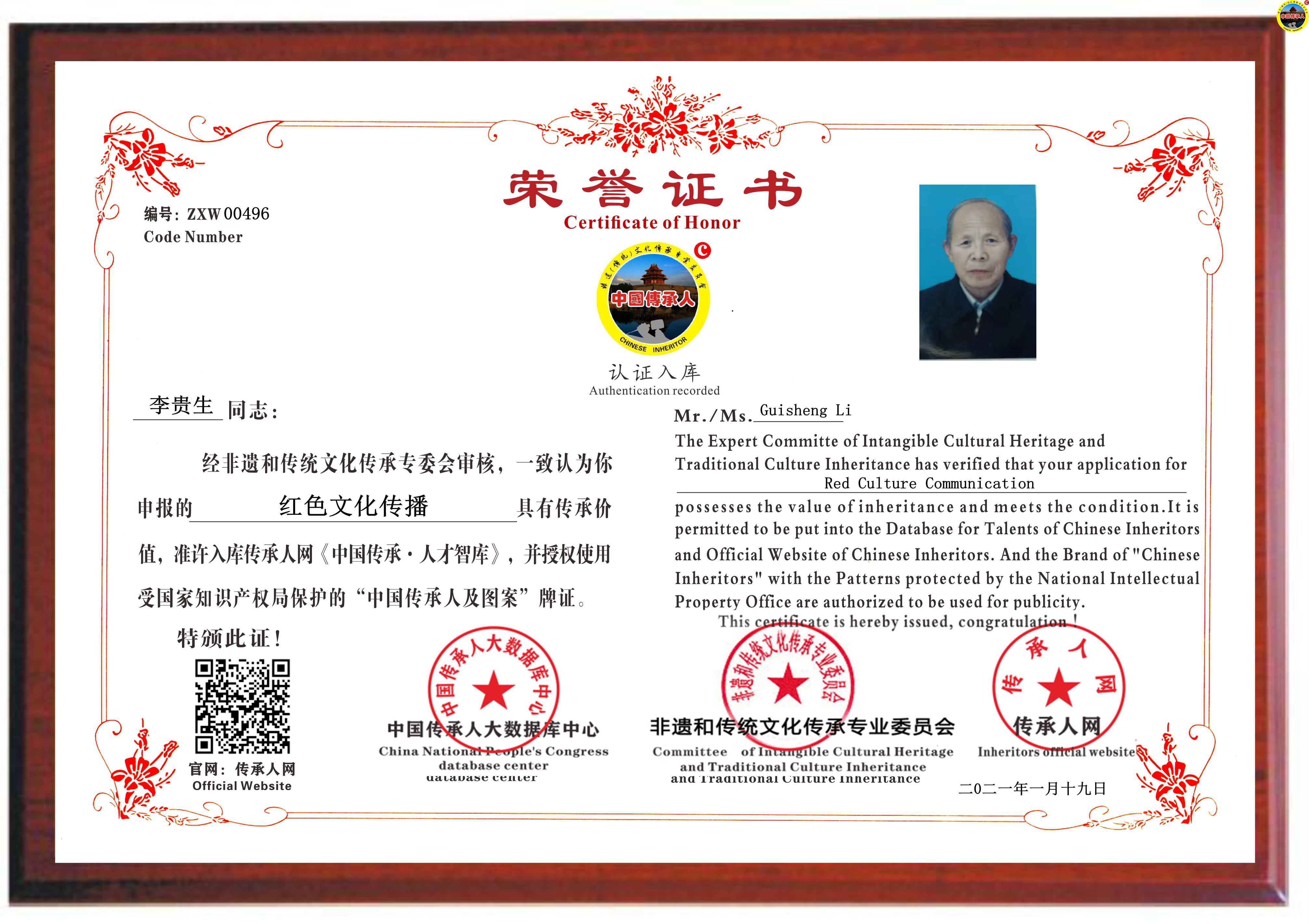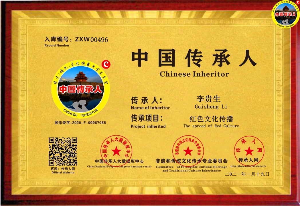 传承人网:2021年1月19日,经中国传承人大数据库中心非遗和传统文化传承专业委员会审核,认为河北省邯郸市李贵生同志申报的“红色文化传播”具有传承价值,符合申报条件,准许入库传承人网《中国传承·人才智库》,并授权使用受知识产权局保护的“中国传承人及图”牌证。