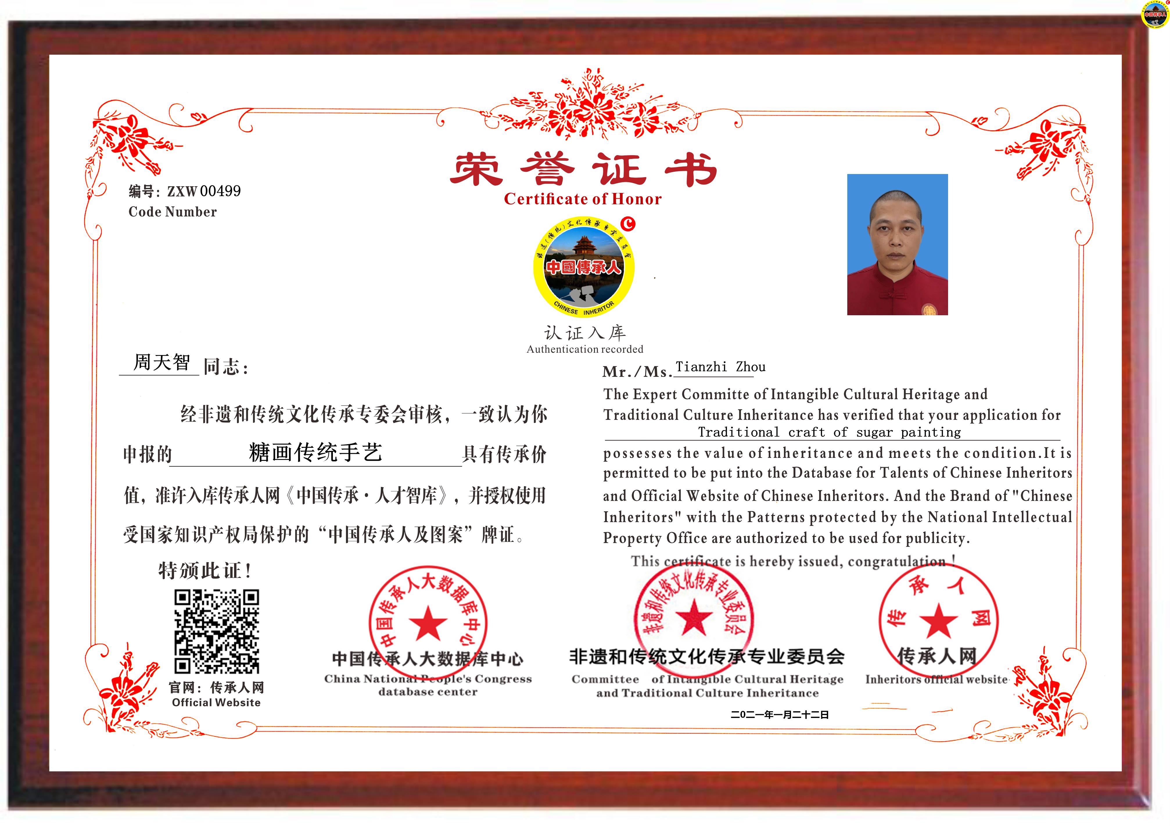 传承人网:2021年1月22日,经中国传承人大数据库中心非遗和传统文化传承专业委员会审核,认为海南省琼海市周天智同志申报的“糖画传统手艺”具有传承价值,符合申报条件,准许入库传承人网《中国传承·人才智库》,并授权使用受知识产权局保护的“中国传承人及图”牌证。