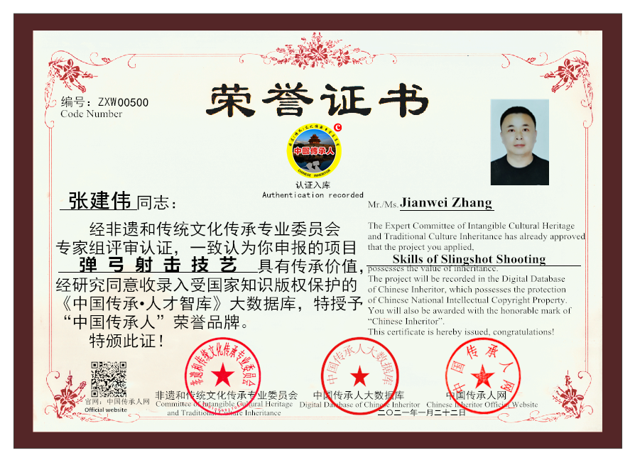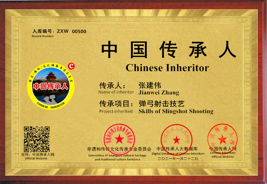 传承人网讯:2021年1月22日,经中国传承人大数据库中心非遗和传统文化传承专业委员会审核,认为四川省成都市张建伟同志申报的“弹弓射击技艺”具有传承价值,符合申报条件,准许入库传承人网《中国传承·人才智库》,并授权使用受知识产权局保护的“中国传承人及图”牌证。