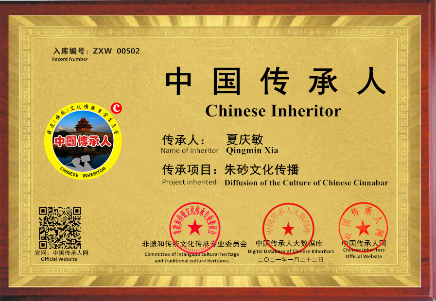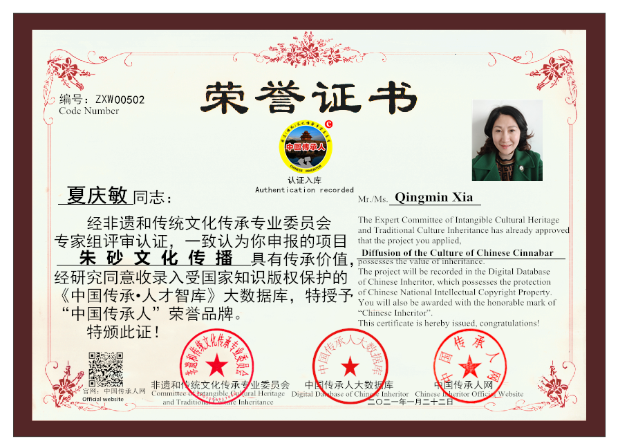 传承人网:2021年1月22日,经非遗和传统文化传承专委会召开专家组评审会议,一致认同贵州省铜仁市夏庆敏同志申报的“朱砂文化传播”具有非遗和传统文化传承价值,准许入库《中国传承·人才智库》