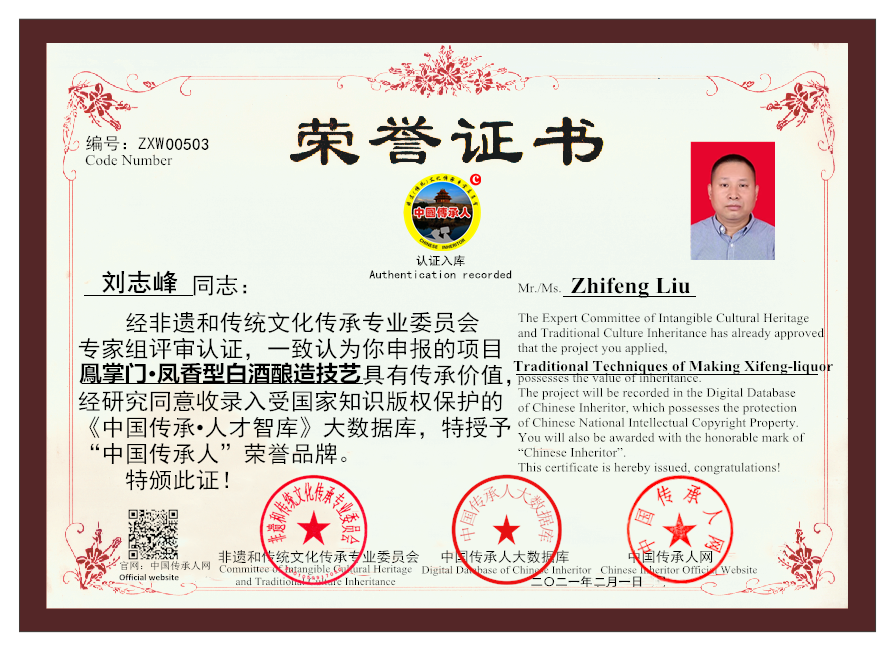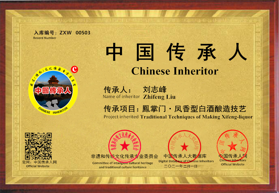 传承人网:2021年2月1日,经非遗和传统文化传承专委会召开专家组评审会议,一致认同陕西省宝鸡市刘志峰同志申报的“鳯掌门·凤香型白酒酿造技艺”具有非遗和传统文化传承价值,准许入库《中国传承·人才智库》