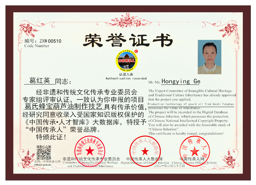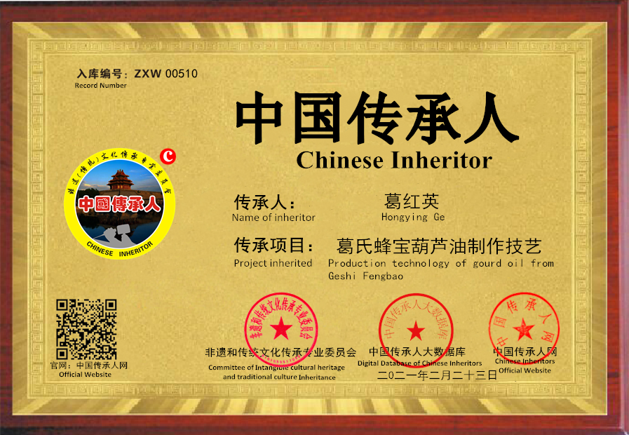 传承人网:2021年2月23日,经非遗和传统文化传承专委会召开专家组评审会议,一致认同广东省深圳市葛红英同志申报的“葛氏蜂宝葫芦油制作技艺”具有非遗和传统文化传承价值,准许入库《中国传承·人才智库》。