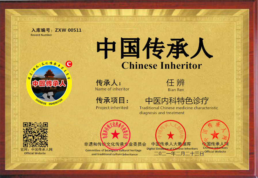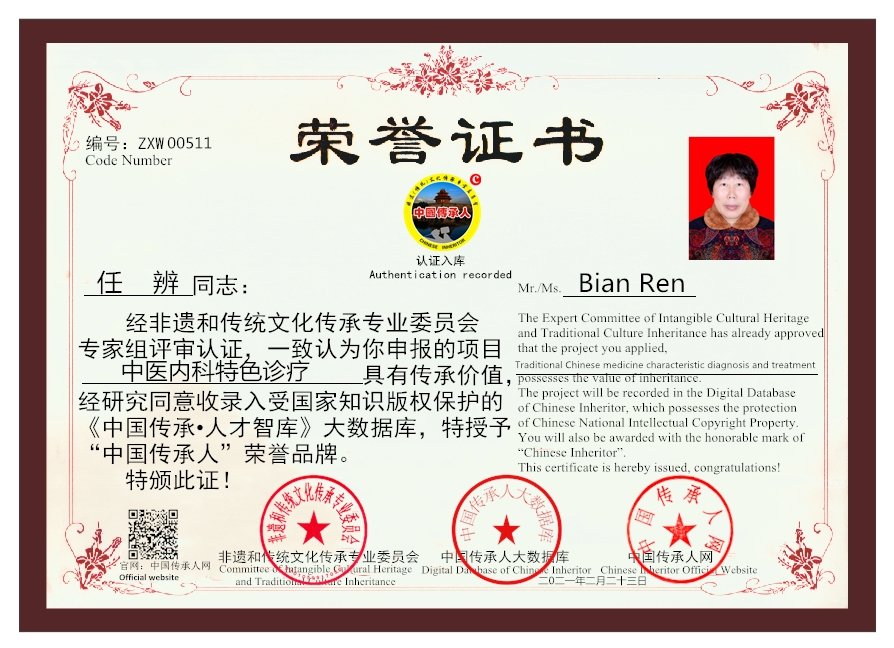 传承人网:2021年2月23日,经非遗和传统文化传承专委会召开专家组评审会议,一致认同河南省襄城县任辨同志申报的“中医内科特色诊疗”具有非遗和传统文化传承价值,准许入库《传承人才智库》。