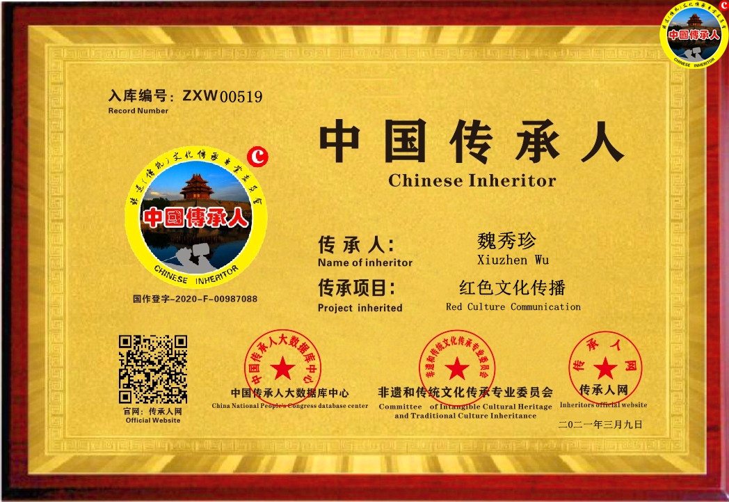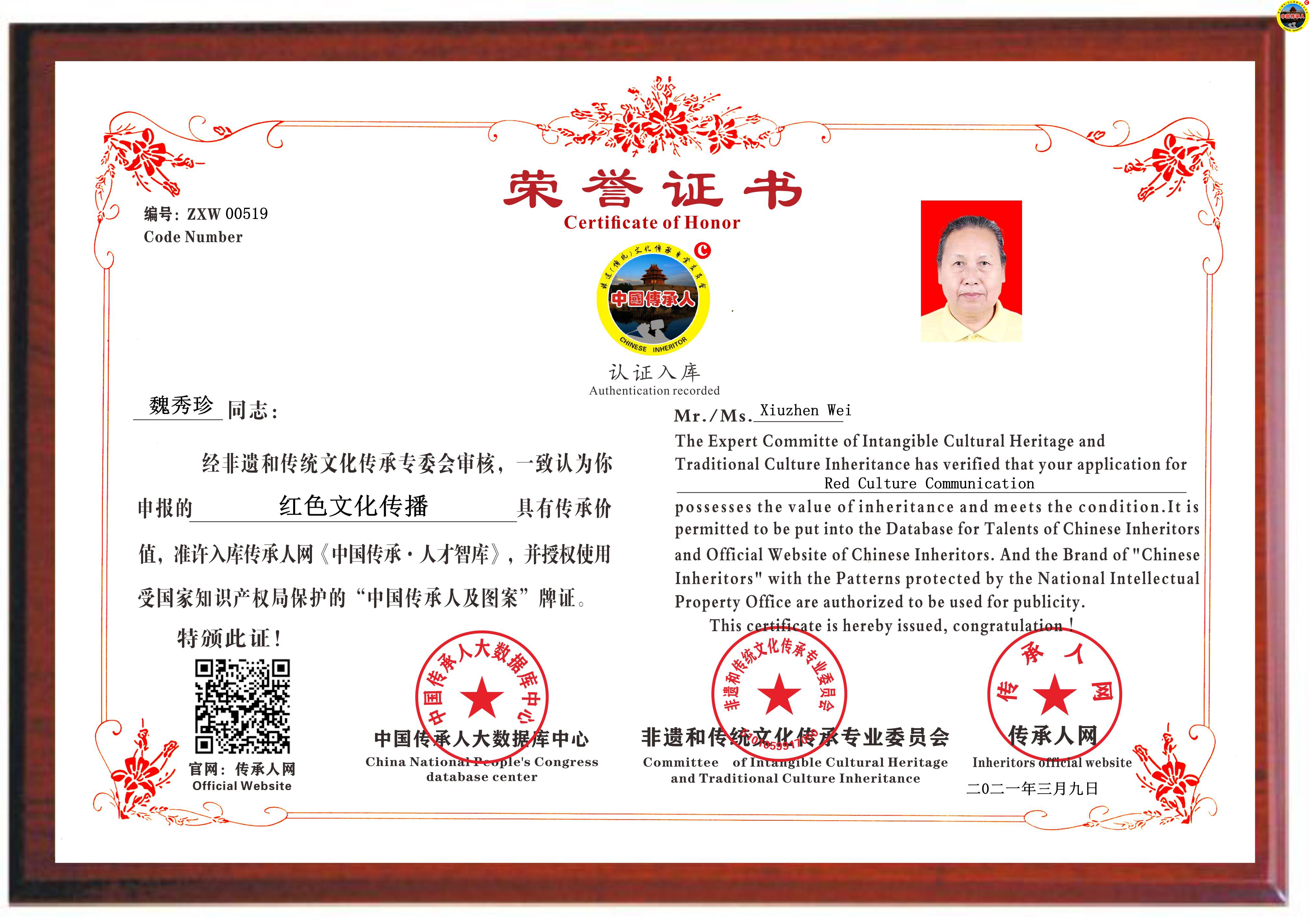 传承人网:2021年3月9日,经非遗和传统文化传承专委会召开专家组评审会议,一致认同河南省郑州市魏秀珍同志申报的“红色文化传播”具有非遗和传统文化传承价值,准许入库《传承人才智库》。