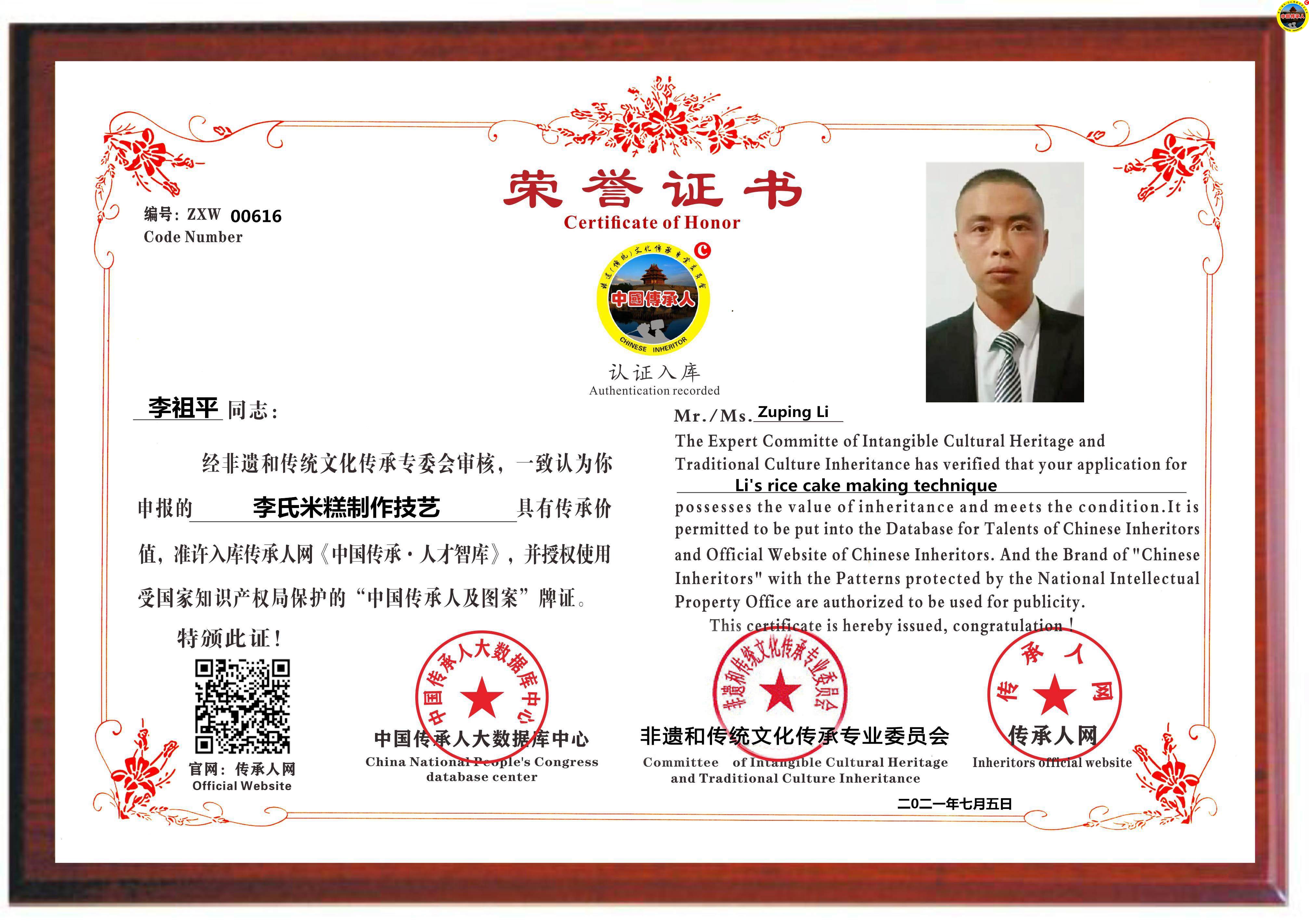 传承人网:2021年7月5日,经中国传承人大数据库中心非遗和传统文化传承专业委员会审核,认为四川省宜宾市李祖平同志申报的“李氏米糕制作技艺”具有传承价值,符合申报条件,准许入库传承人网《中国传承·人才智库》,并授权使用受知识产权保护的“中国传承人及图”牌证。
