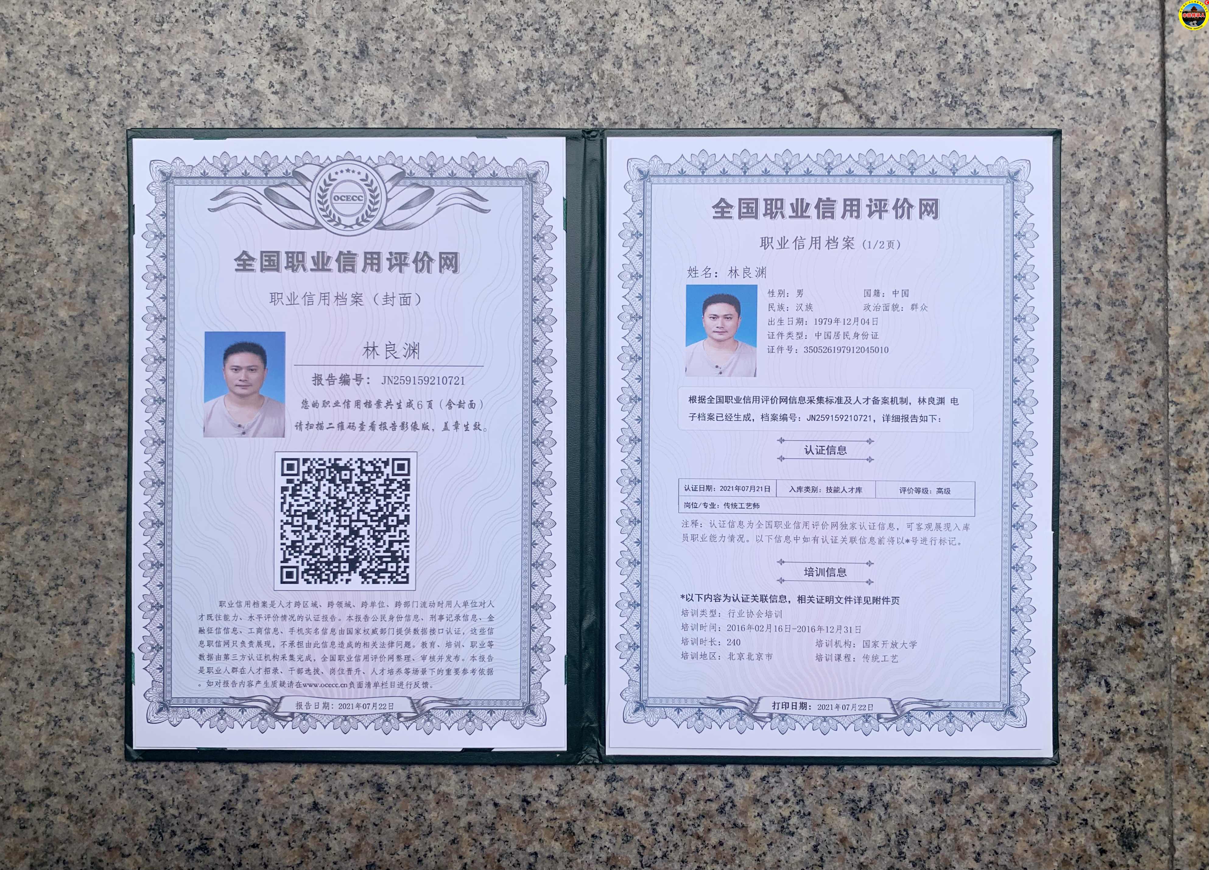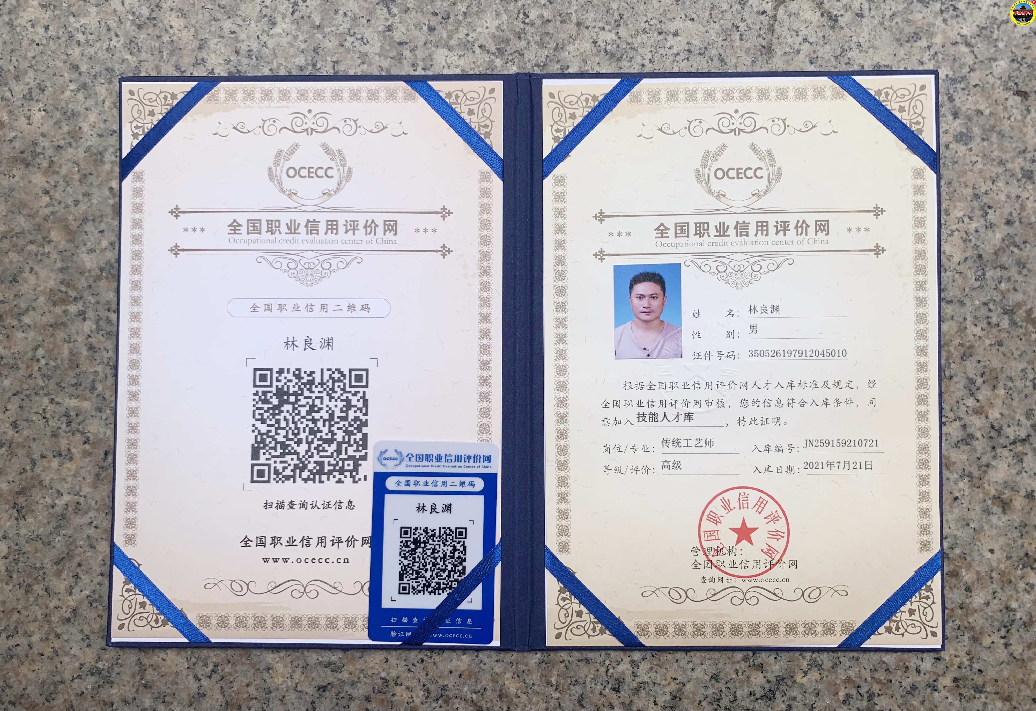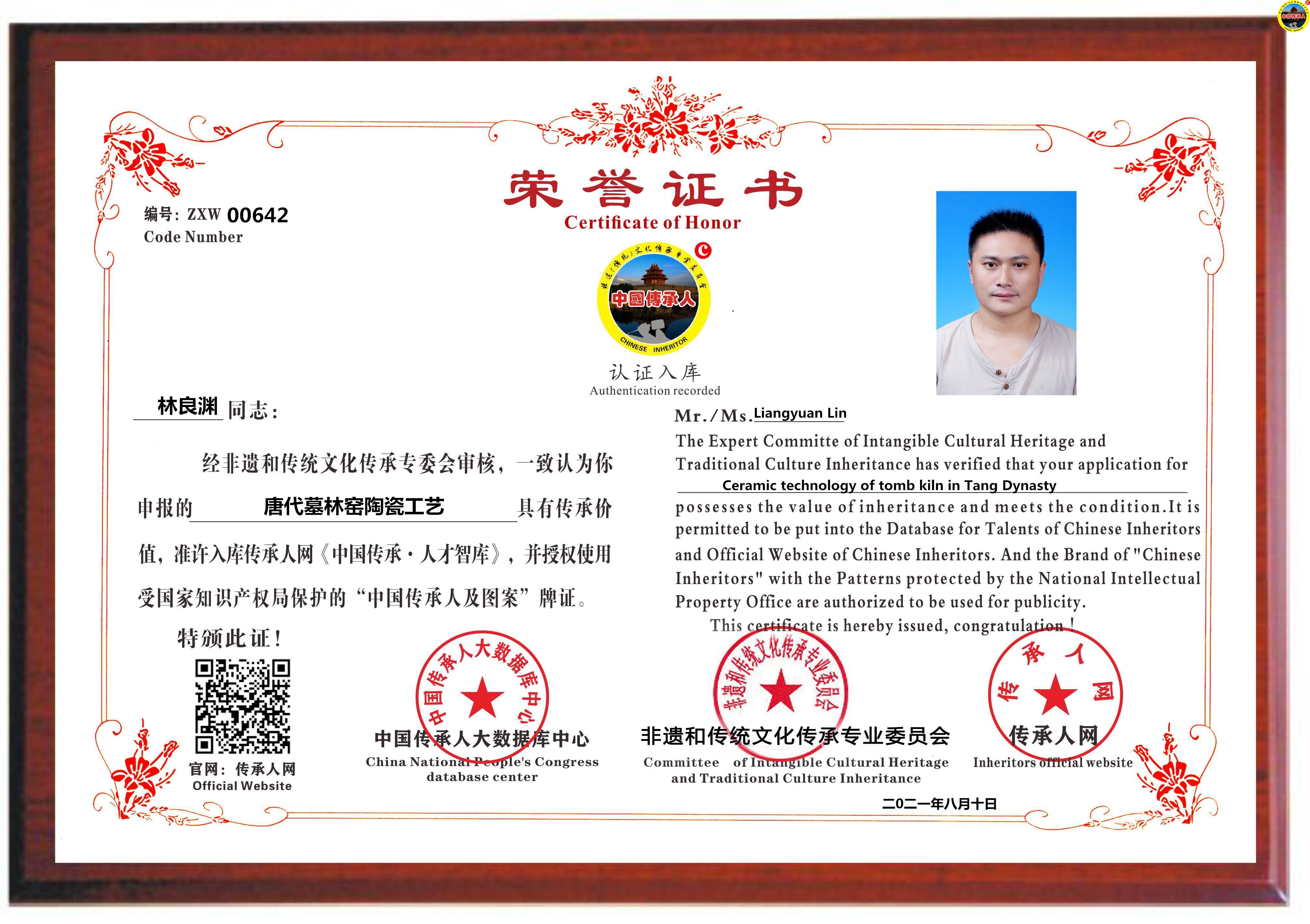 传承人网:2021年8月10日,经中国传承人大数据库中心非遗和传统文化传承专业委员会审核,认为福建省泉州市林良渊同志申报的“唐代墓林窑陶瓷工艺”具有传承价值,符合申报条件,准许入库传承人网《中国传承·人才智库》,并授权使用受知识产权局保护的“中国传承人及图”牌证。