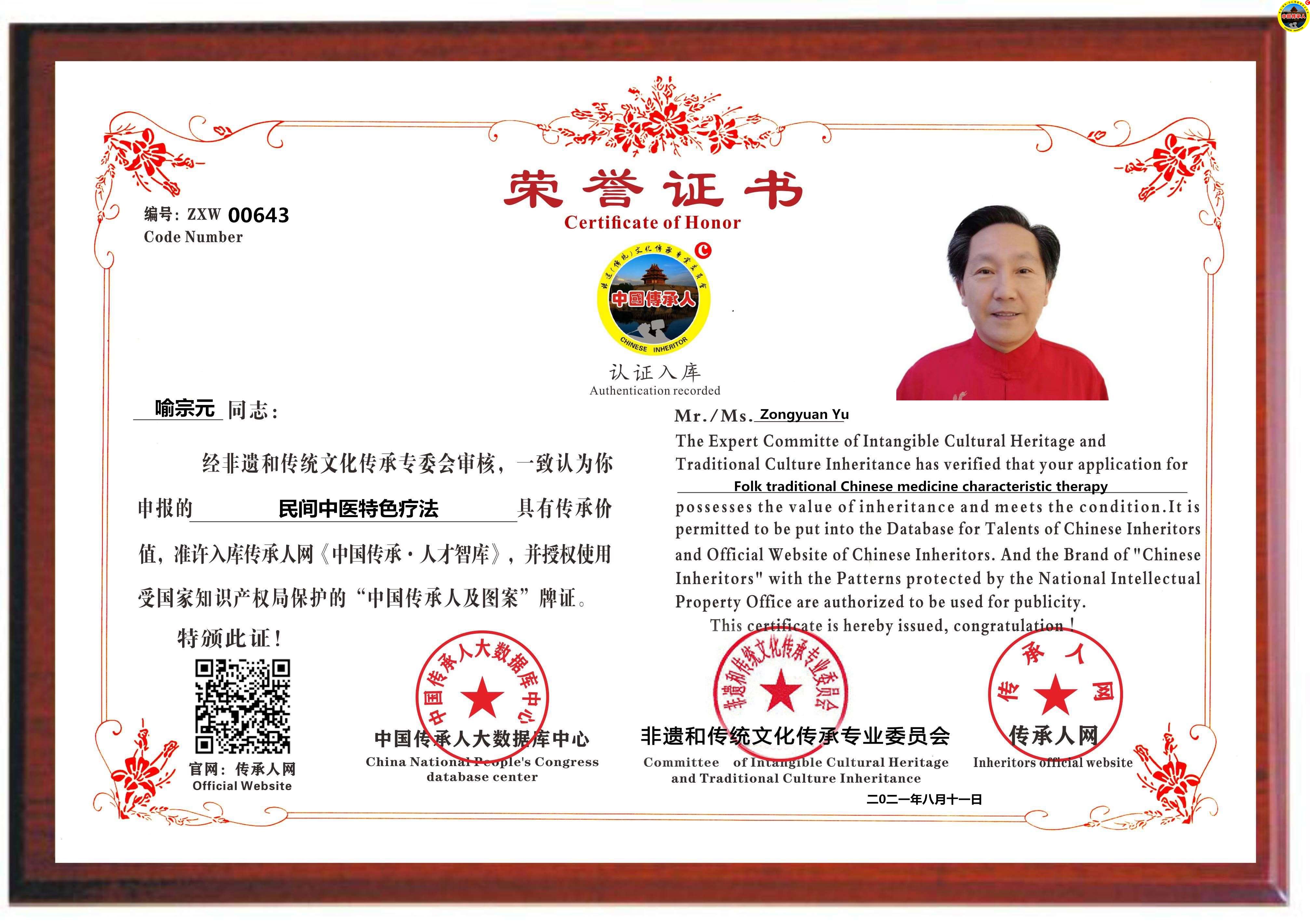 传承人网:2021年8月11日,经中国传承人大数据库中心非遗和传统文化传承专业委员会审核,认为江西省九江市喻宗元同志申报的“民间中医特色疗法”具有传承价值,符合申报条件,准许入库传承人网《中国传承·人才智库》,并授权使用受知识产权局保护的“中国传承人及图”牌证。