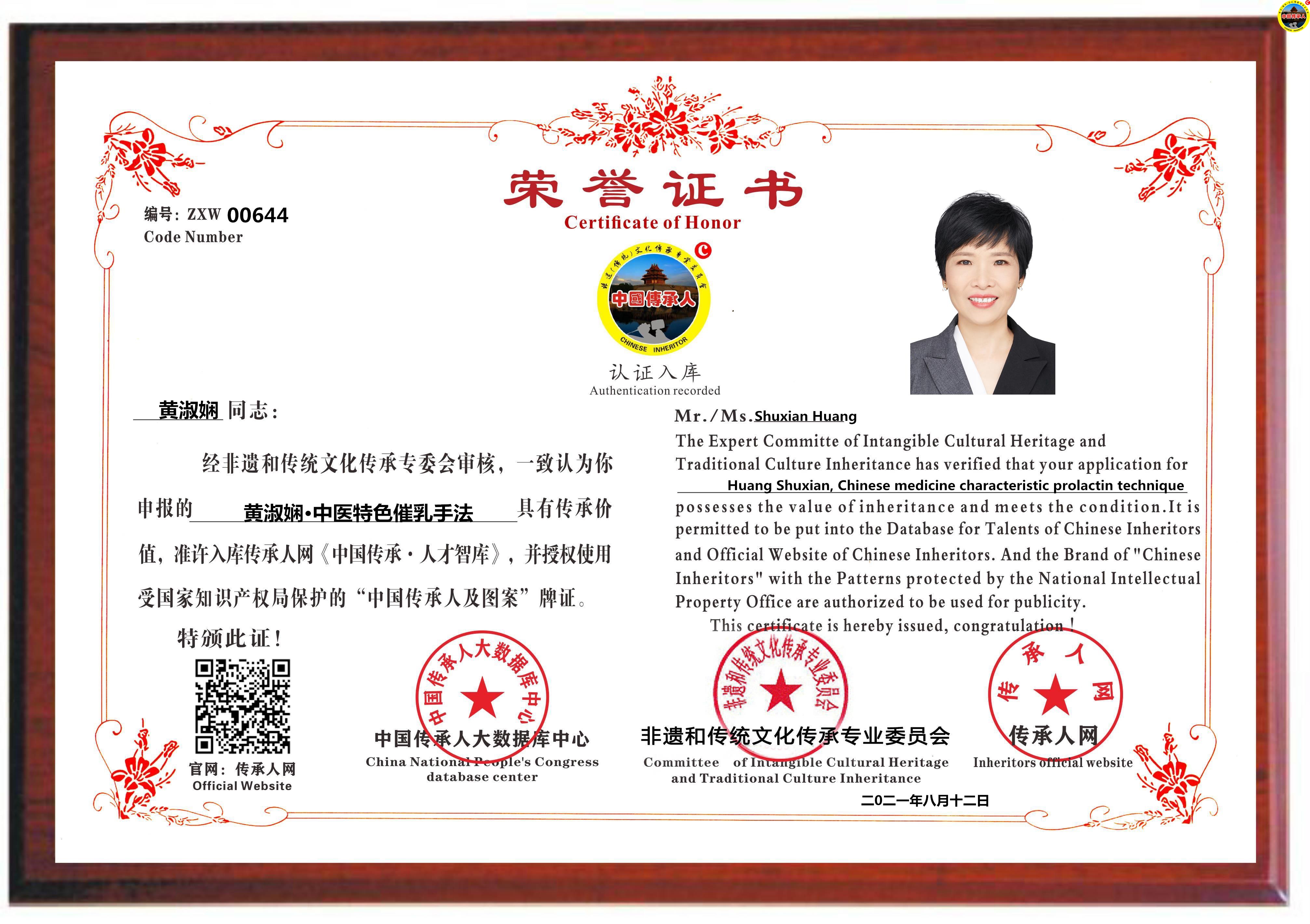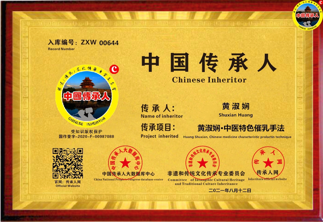 传承人网:2021年8月12日,经中国传承人大数据库中心非遗和传统文化传承专业委员会审核,认为广东省广州市黄淑娴同志申报的“黄淑娴·中医特色催乳手法”具有传承价值,符合申报条件,准许入库传承人网《中国传承·人才智库》,并授权使用受知识产权局保护的“中国传承人及图”牌证。