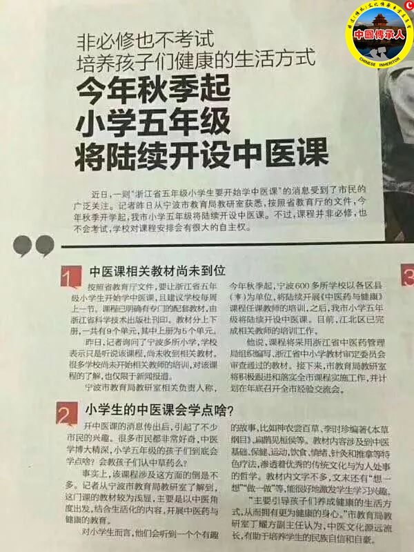 传承人网:此次疫情中医药发挥了重要作用,成为了这次疫情防控的一大亮点。好消息传来了,小学五年级起开始学中医啦!先在浙江省试点,然后在全国范围展开。当以后的孩子长大了,再也没有谁能阻挡中医的光芒!