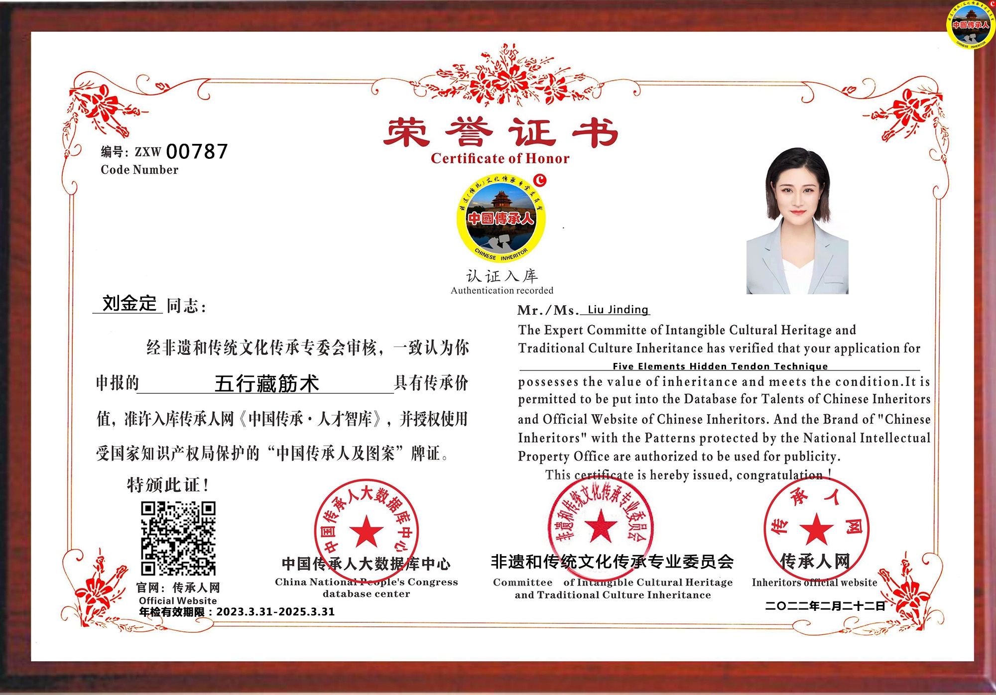传承人网:2022年2月22日,经中国传承人大数据库中心非遗和传统文化传承专业委员会审核,认为福建省厦门市刘金定同志申报的“五行藏筋术”具有传承价值,符合申报条件,准许入库传承人网《中国传承·人才智库》,并授权使用受知识产权保护的“中国传承人及图”牌证。