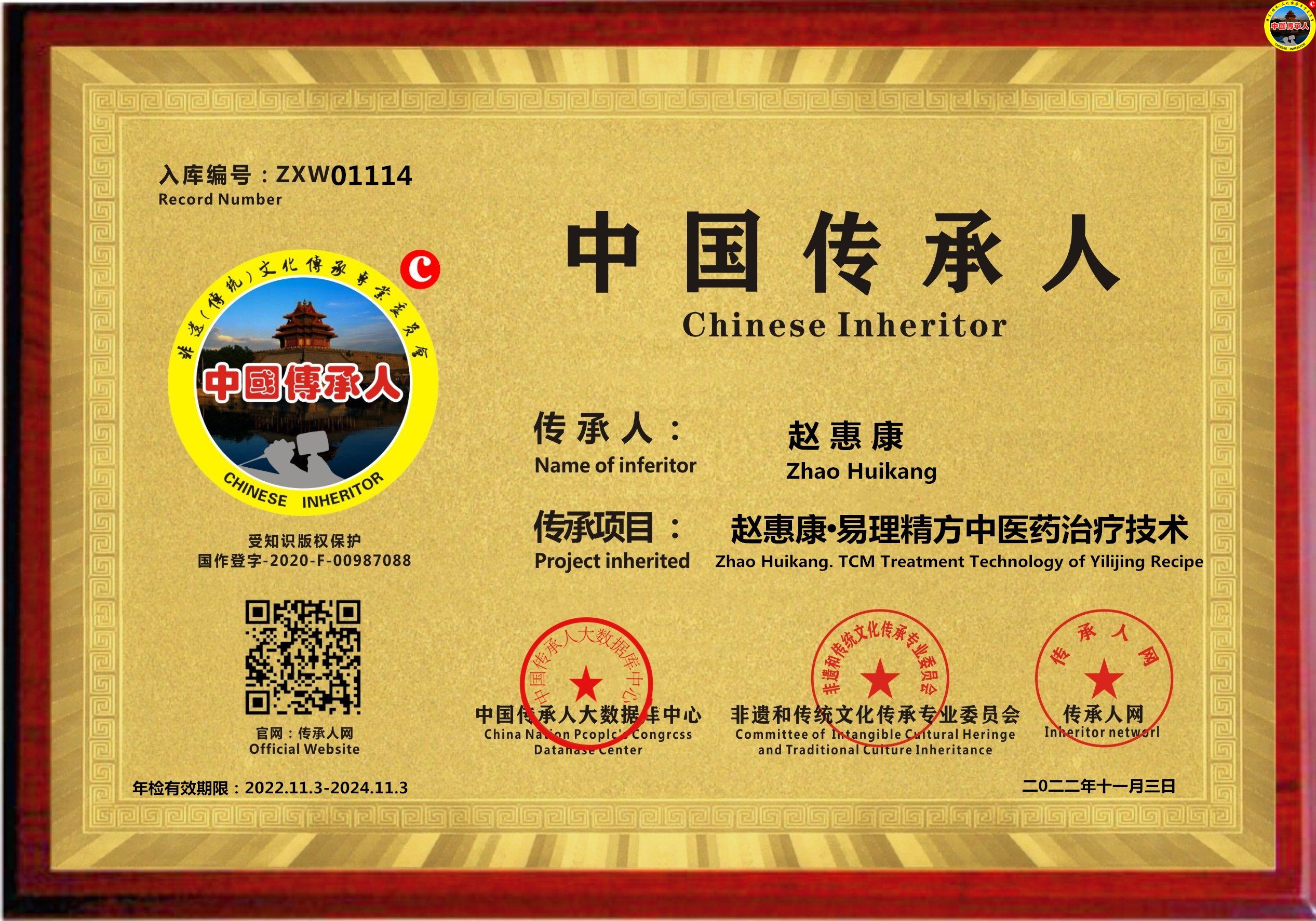 传承人网:2022年11月14日,经中国传承人大数据库中心非遗和传统文化传承专业委员会审核,认为山东省沂水赵惠康同志申报的“赵惠康·易理精方中医药治疗技术”具有传承价值,符合申报条件,准许入库传承人网《中国传承·人才智库》,并授权使用受知识产权保护“中国传承人及图”牌证。