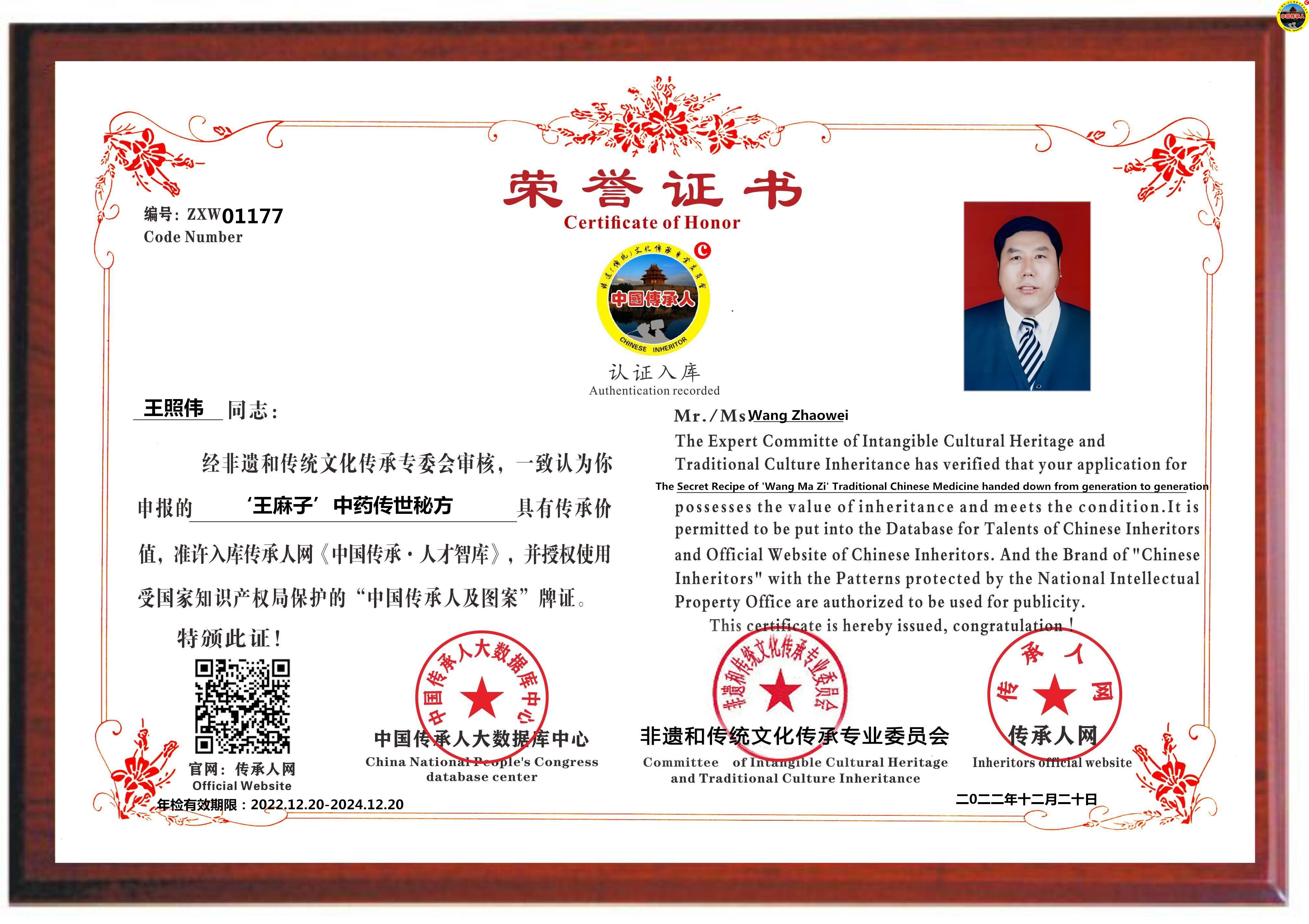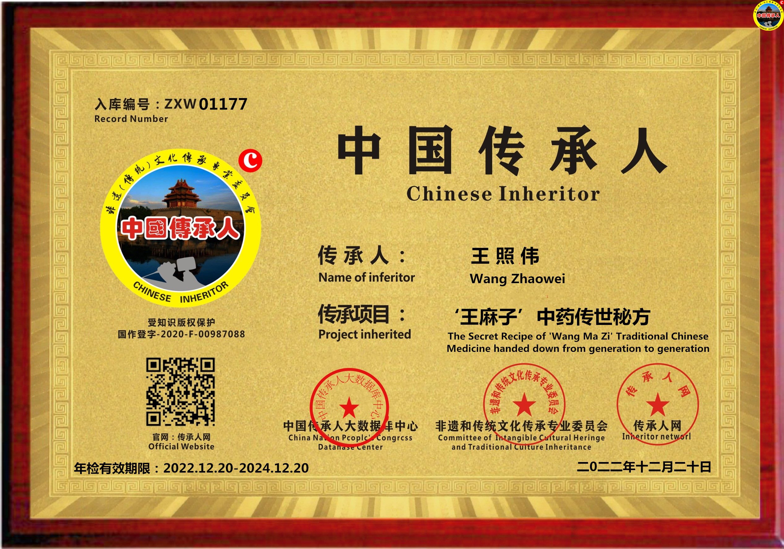 传承人网:2022年12月29日,经中国传承人大数据库中心非遗和传统文化传承专业委员会审核,认为吉林省延安市同志申报的“‘王麻子’中药传世秘方”具有传承价值,符合申报条件,准许入库传承人网《中国传承·人才智库》,并授权使用受知识产权保护“中国传承人及图”牌证。