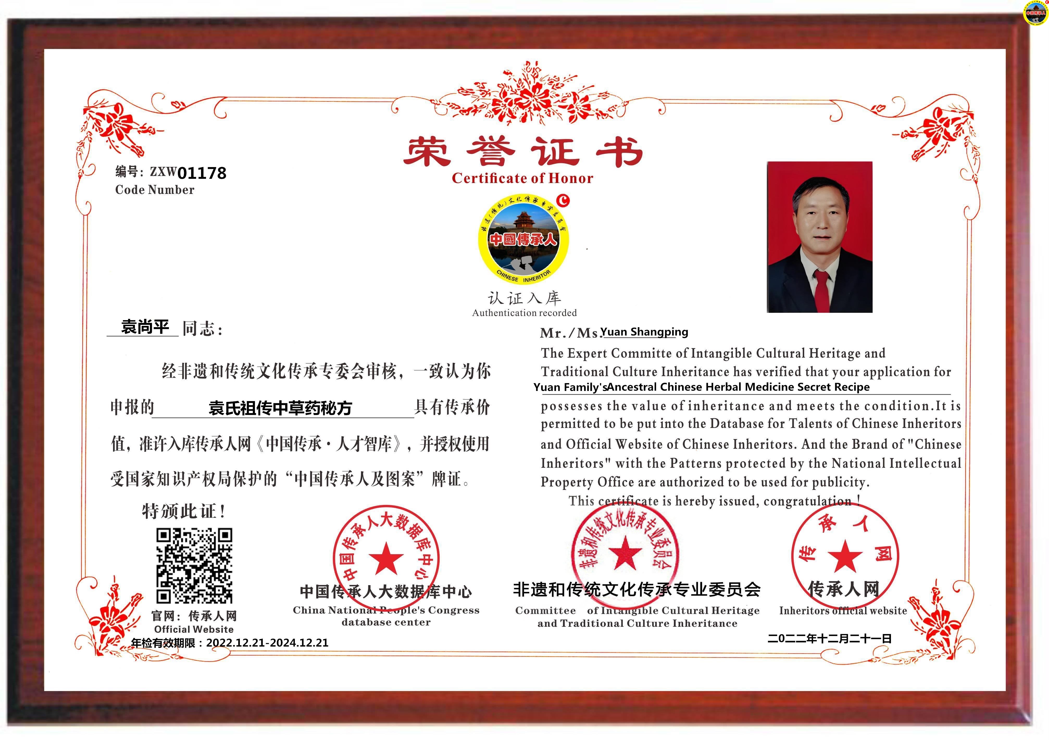 传承人网:2022年12月29日,经中国传承人大数据库中心非遗和传统文化传承专业委员会审核,认为贵州省威宁县袁尚平同志申报的“袁氏祖传中草药秘方”具有传承价值,符合申报条件,准许入库传承人网《中国传承·人才智库》,并授权使用受知识产权保护“中国传承人及图”牌证。