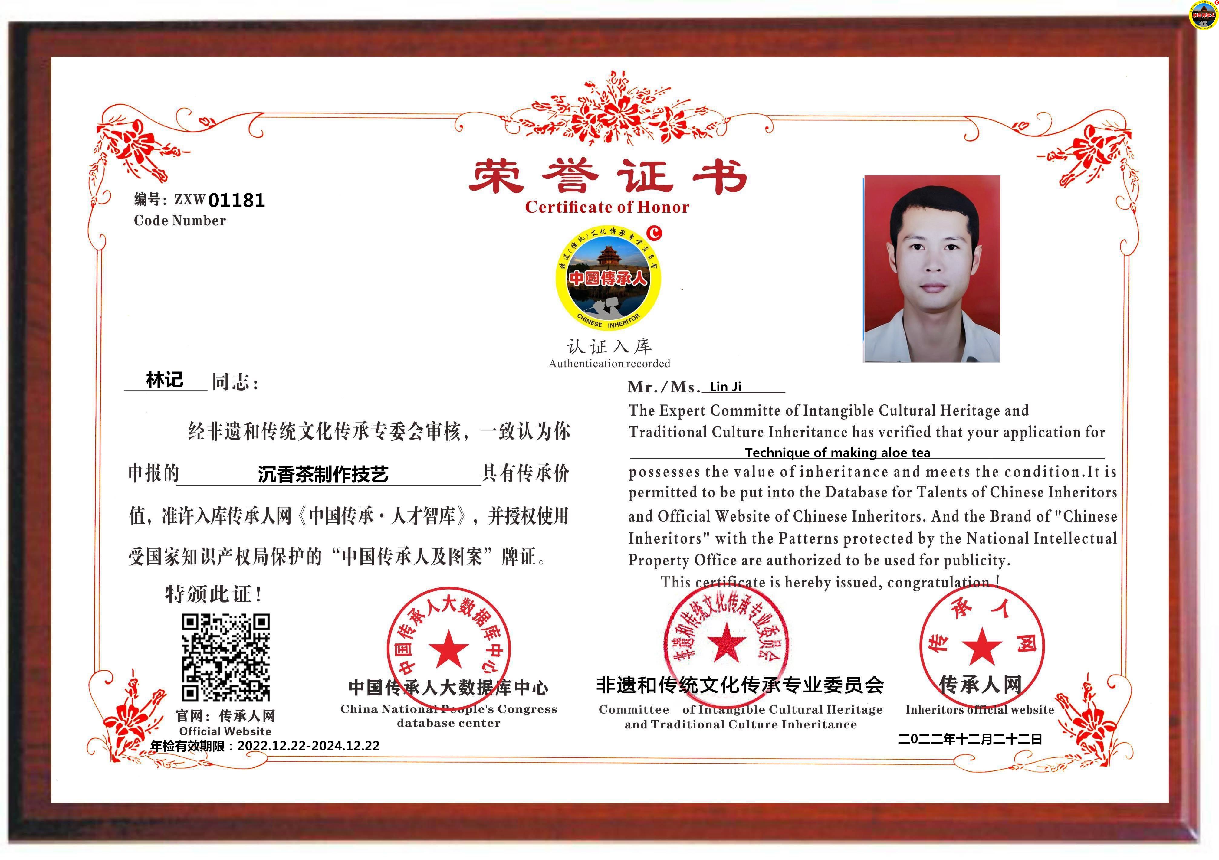 传承人网:2023年01月03日,经中国传承人大数据库中心非遗和传统文化传承专业委员会审核,认为广东省广州市林记同志申报的“沉香茶制作技艺”具有传承价值,符合申报条件,准许入库传承人网《中国传承·人才智库》,并授权使用受知识产权保护“中国传承人及图”牌证。