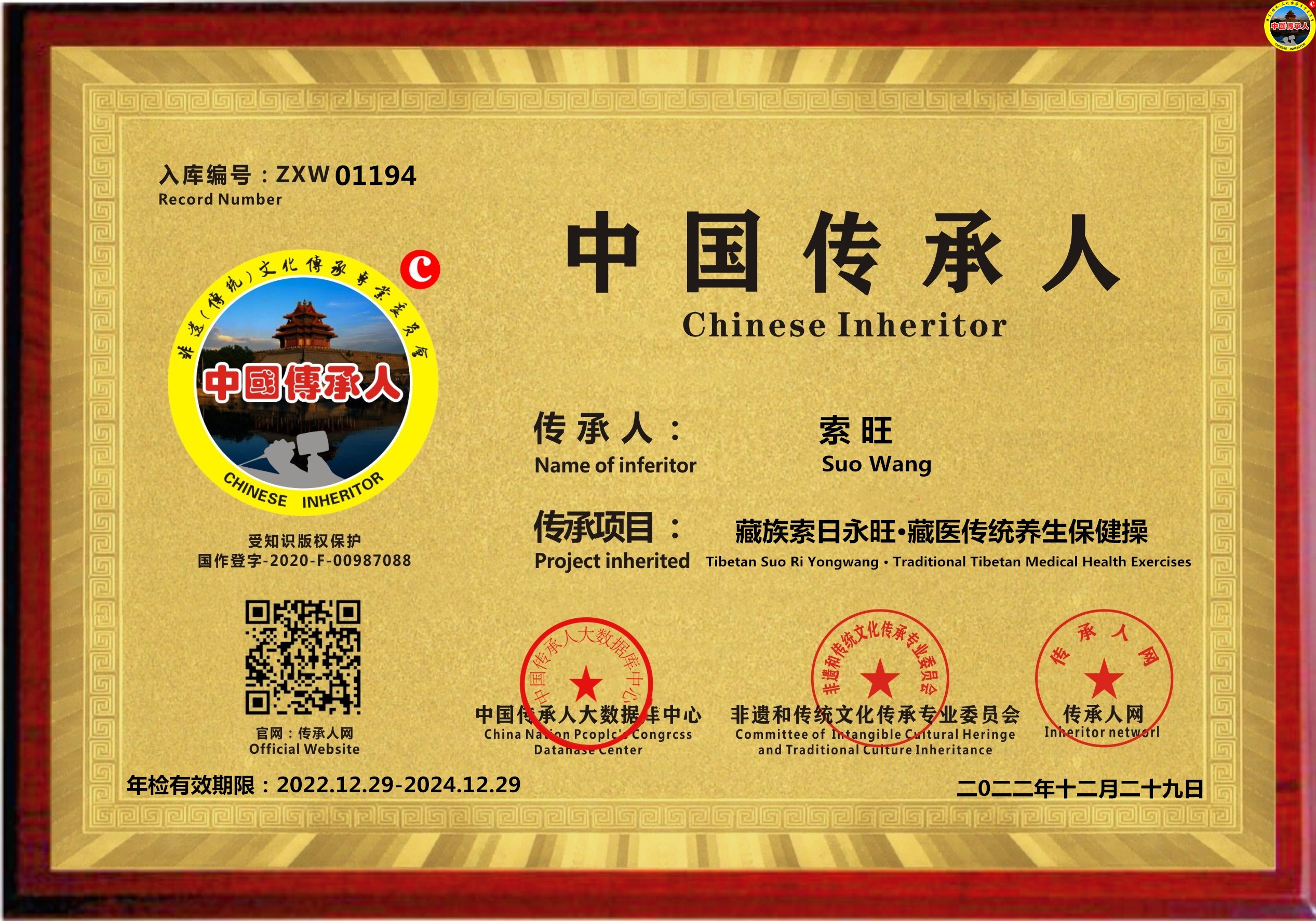 传承人网:2023年01月12日,经中国传承人大数据库中心非遗和传统文化传承专业委员会审核,认为西藏日喀则市索旺同志申报的“藏族索日永旺•藏医传统养生保健操”具有传承价值,符合申报条件,准许入库传承人网《中国传承·人才智库》,并授权使用受知识产权保护“中国传承人及图”牌证。