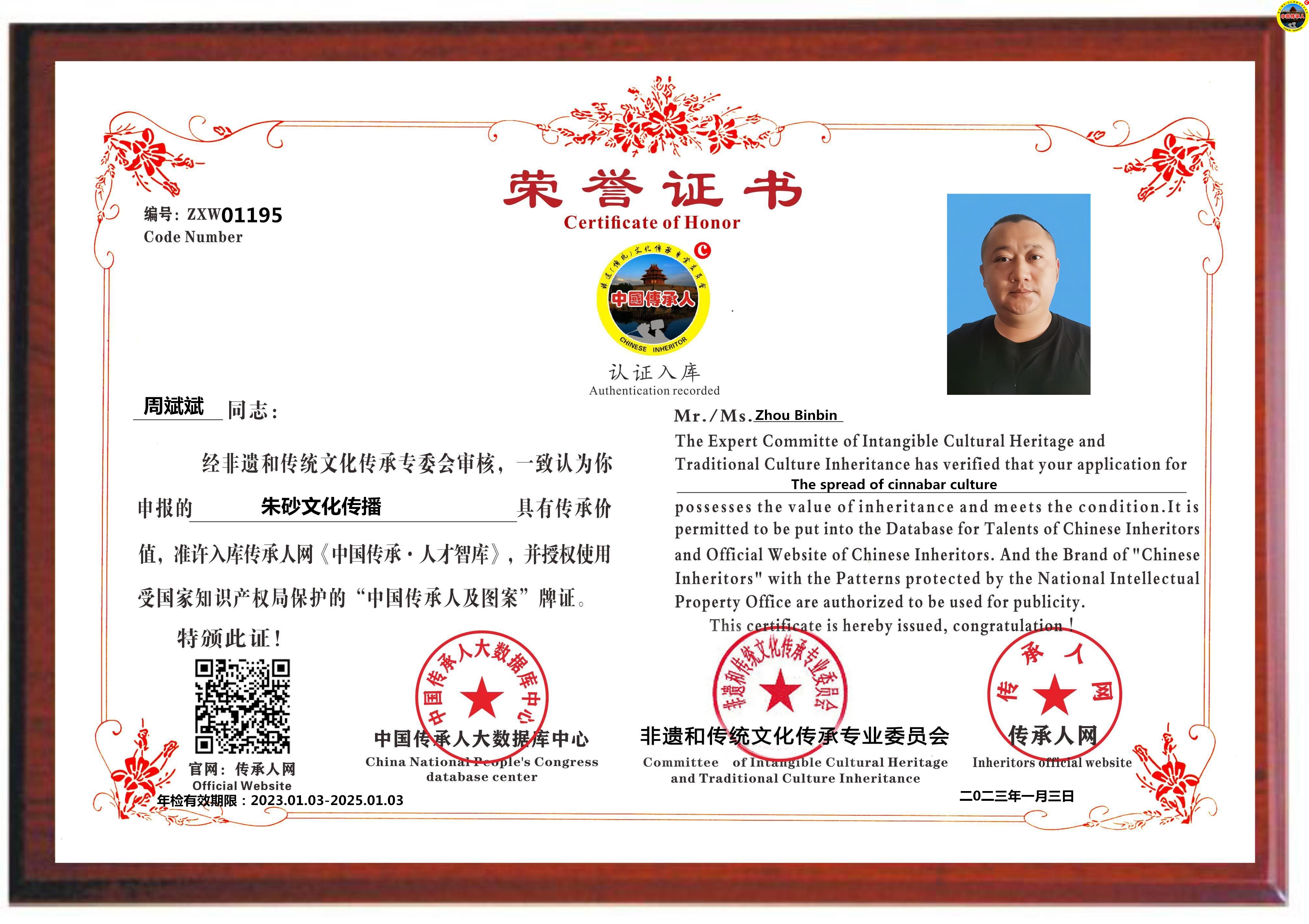 传承人网:2023年01月12日,经中国传承人大数据库中心非遗和传统文化传承专业委员会审核,认为贵州省贵阳市周斌斌同志申报的“朱砂文化传播”具有传承价值,符合申报条件,准许入库传承人网《中国传承·人才智库》,并授权使用受知识产权保护“中国传承人及图”牌证。