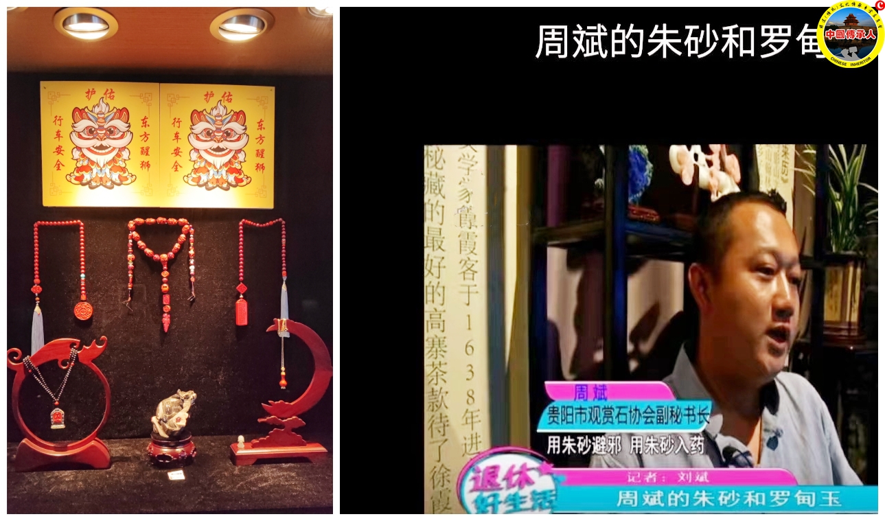 朱砂又名辰砂,属于硫化物类矿物,为粒状或块状集合体,呈颗粒状或块片状。鲜红色或暗红色,条痕红色至褐红色,纯度越高,金属光泽越明显,主产于贵州铜仁,在湖南、湖北、四川、广西、云南等地也有少量储备。朱砂用途广泛,在佛教,道教,儒教,中医药中都有广泛应用,既可以用于高级绘画颜料,也可以用作高端化妆品的成分,用作中药有清心镇惊、安神、明目、解毒、消炎等功效。周斌斌收藏朱砂并从事朱砂行业多年,对朱砂的开采,提炼,加工,工艺,雕刻,设计,以及朱砂的价值及药用价值了然于胸,并多次在国内外举办弘扬传播贵州千年的朱砂文化讲座,被国内外多家媒体多次报道。