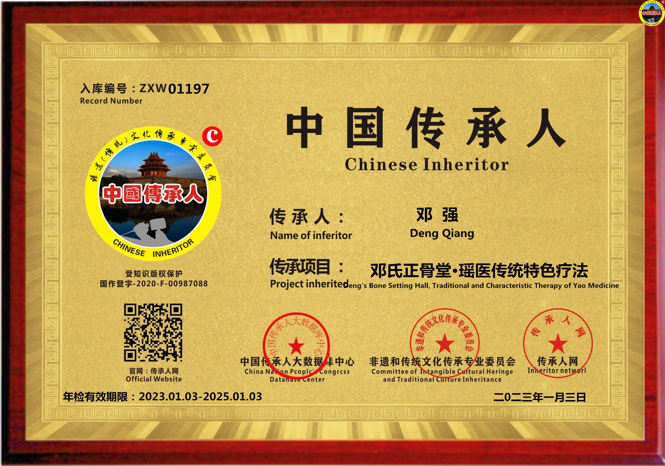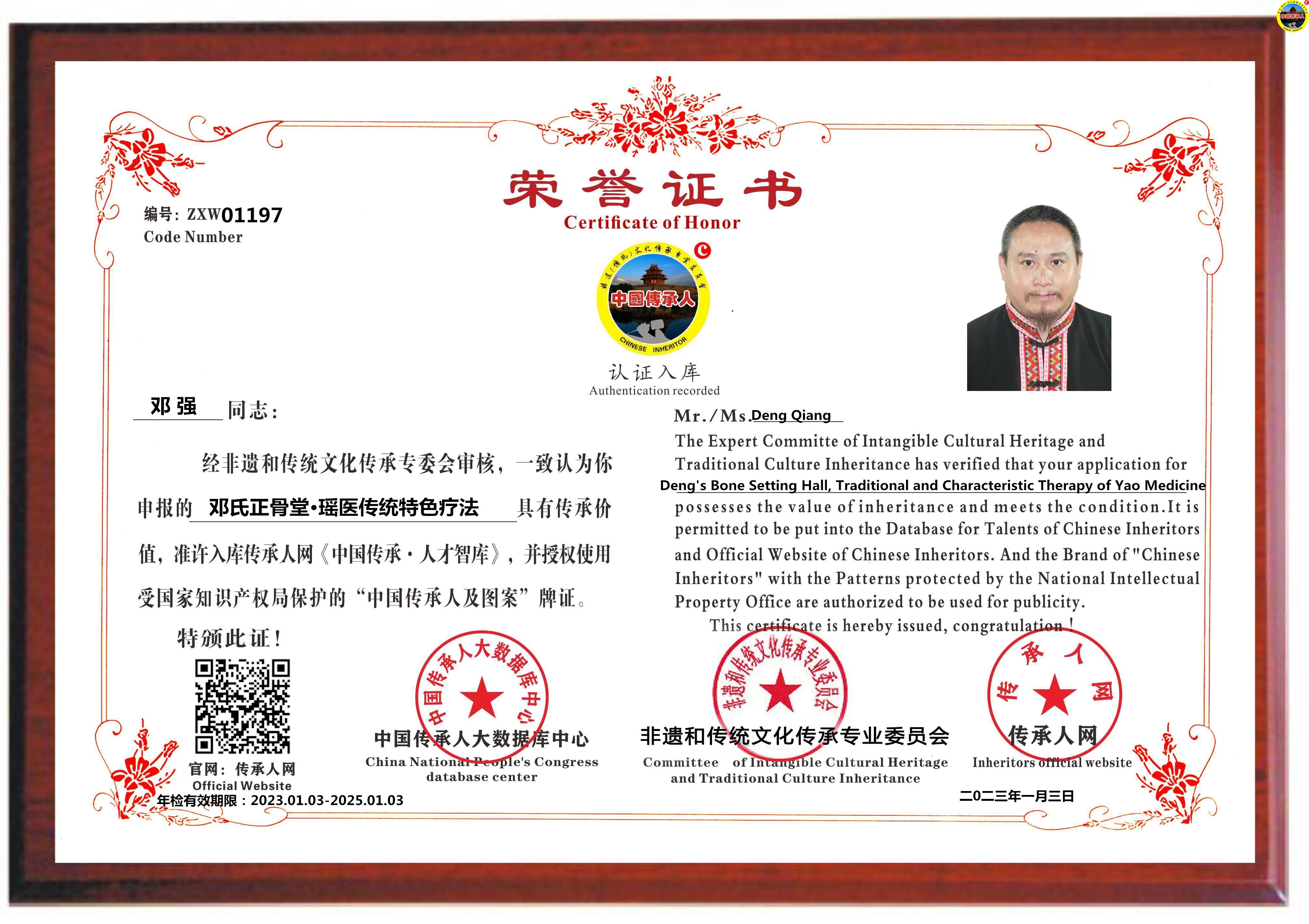 传承人网:2023年01月13日,经中国传承人大数据库中心非遗和传统文化传承专业委员会审核,认为广东省清远市邓强同志申报的“邓氏正骨堂·瑶医传统特色疗法”具有传承价值,符合申报条件,准许入库传承人网《中国传承·人才智库》,并授权使用受知识产权保护“中国传承人及图”牌证。
