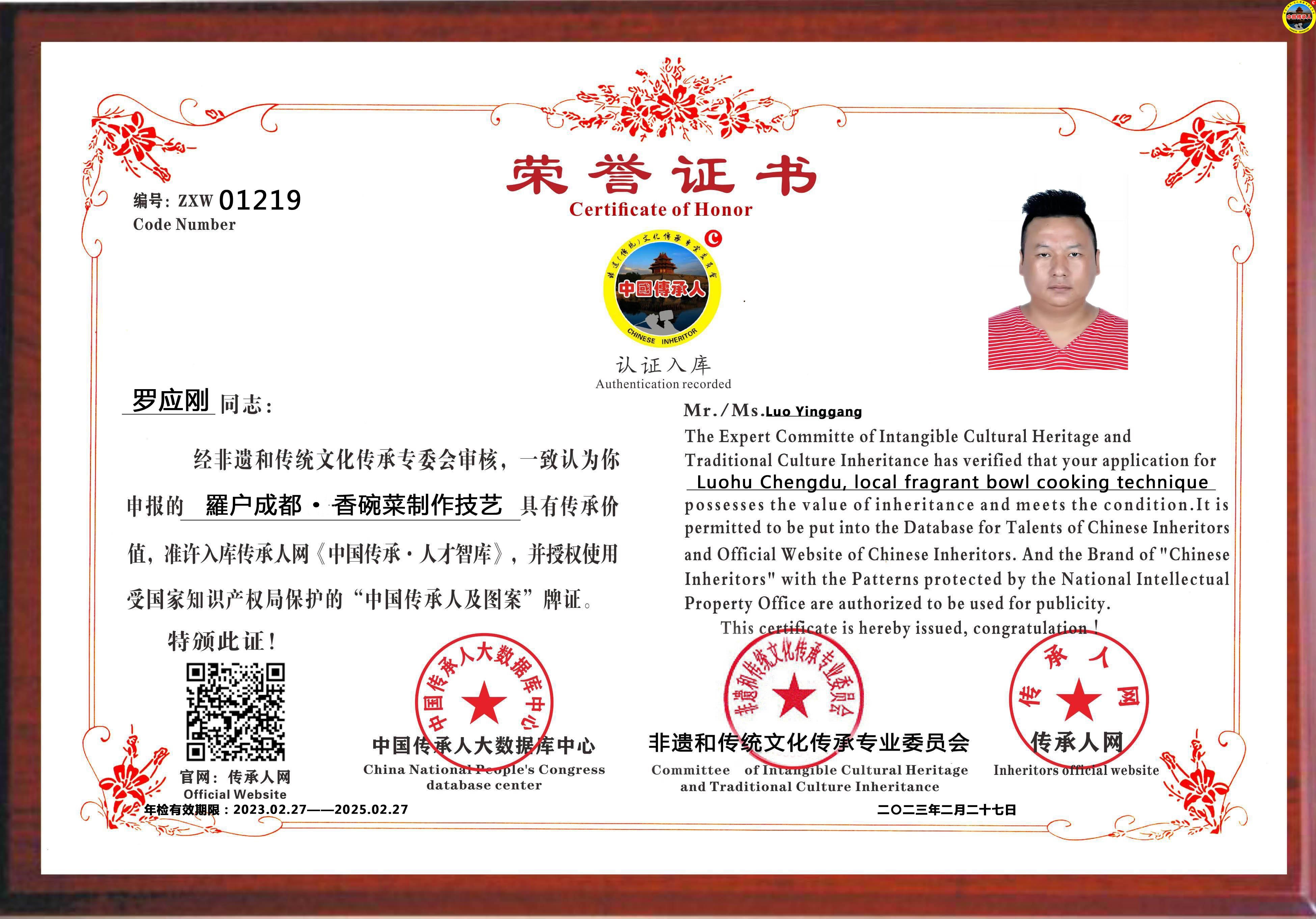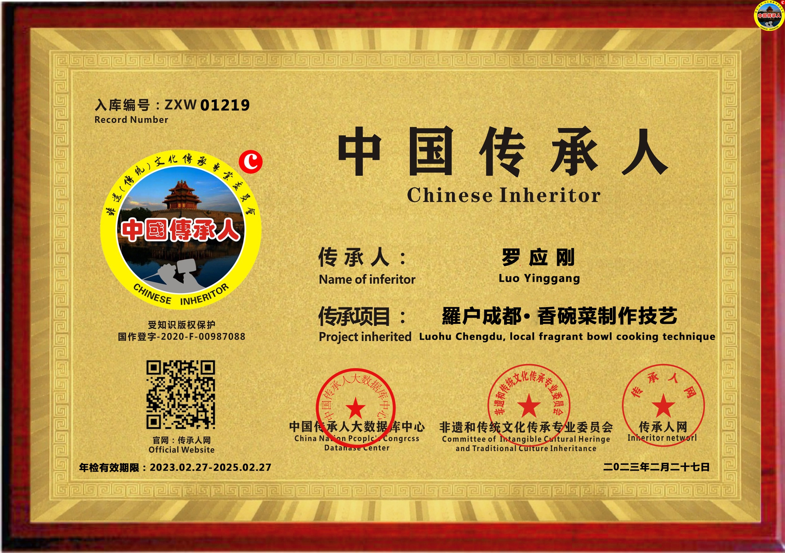 传承人网:2023年2月27日,经中国传承人大数据库中心非遗和传统文化传承专业委员会审核,认为四川省会理县罗应刚同志申报的“羅户成都·香碗菜制作技艺”具有传承价值,符合申报条件,准许入库传承人网《中国传承·人才智库》,并授权使用受国家知识产权局保护的“中国传承人及图”牌证。