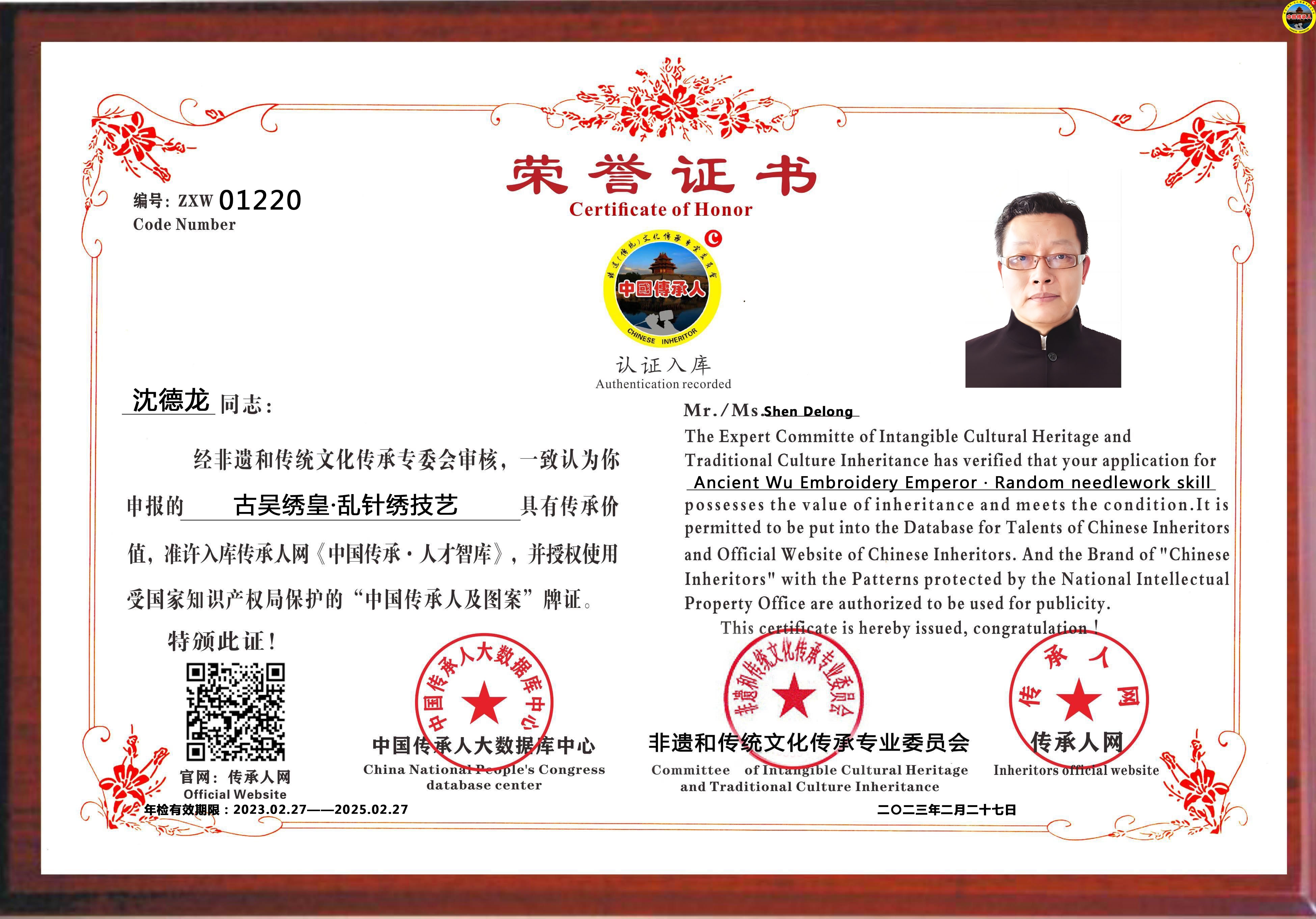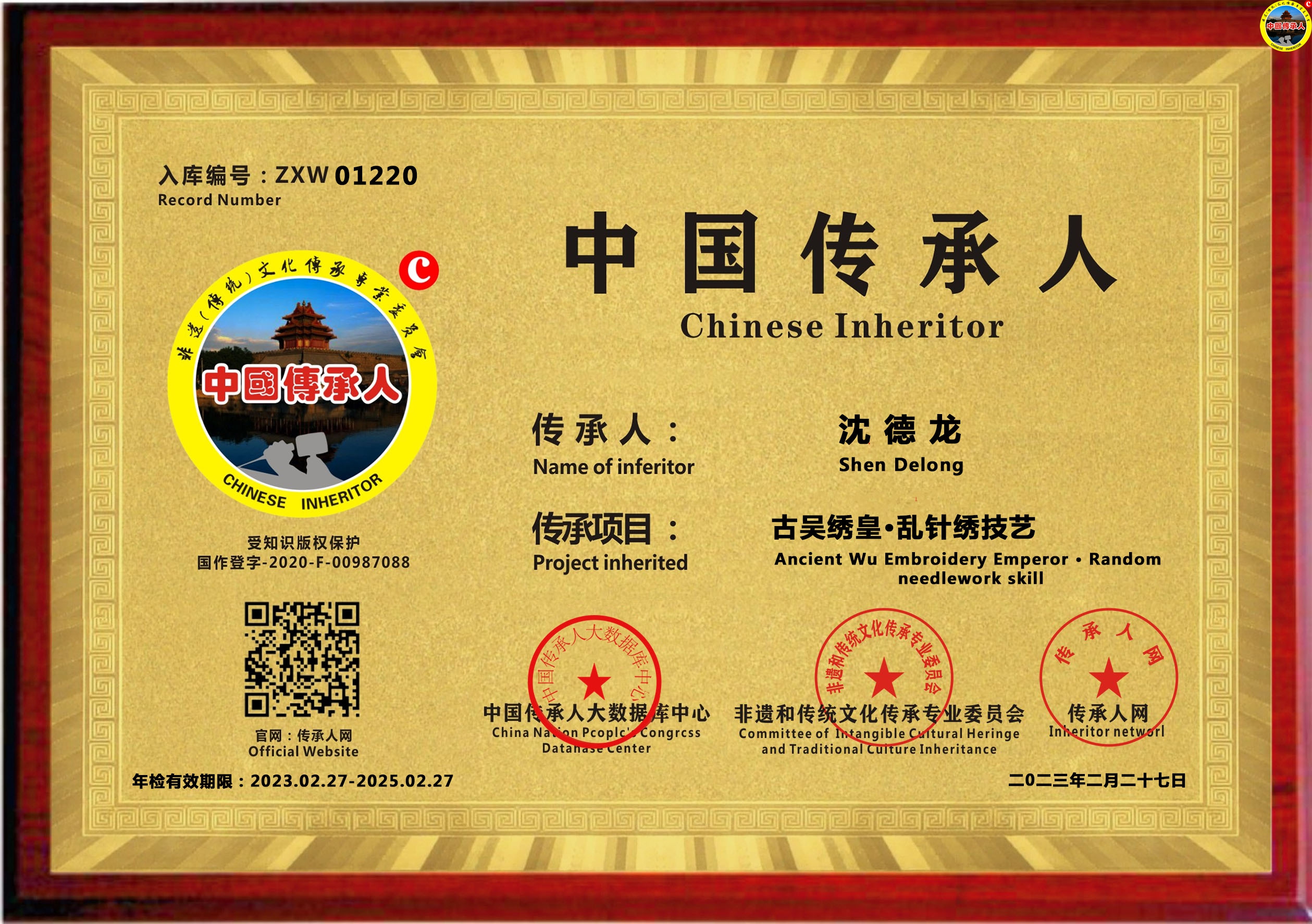 传承人网:2023年2月28日,经中国传承人大数据库中心非遗和传统文化传承专业委员会审核,认为江苏省苏州市沈德龙同志申报的“古吴绣皇·乱针绣技艺”具有传承价值,符合申报条件,准许入库传承人网《中国传承·人才智库》,并授权使用受国家知识产权局保护的“中国传承人及图”牌证。