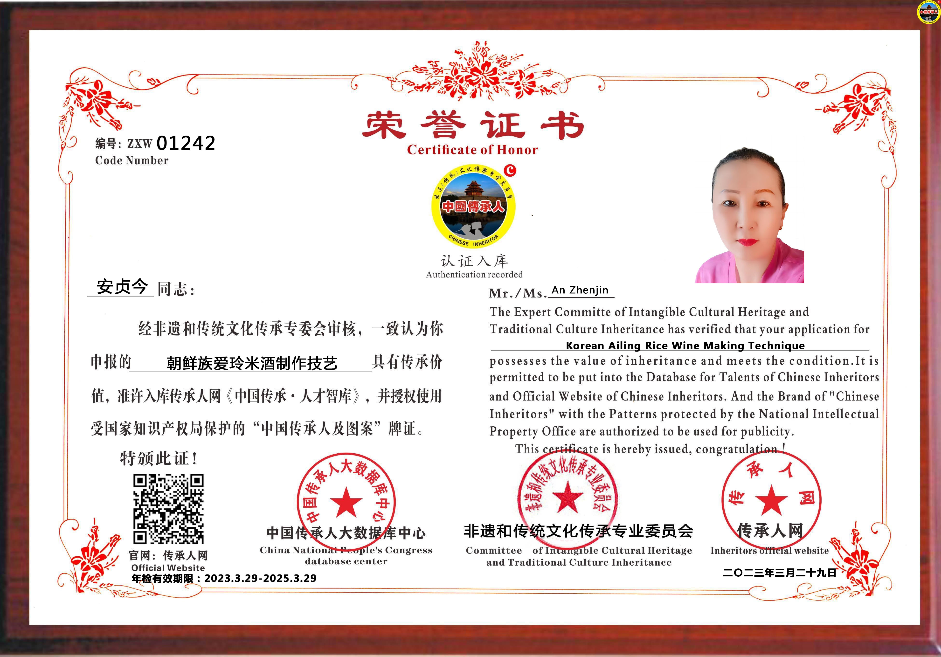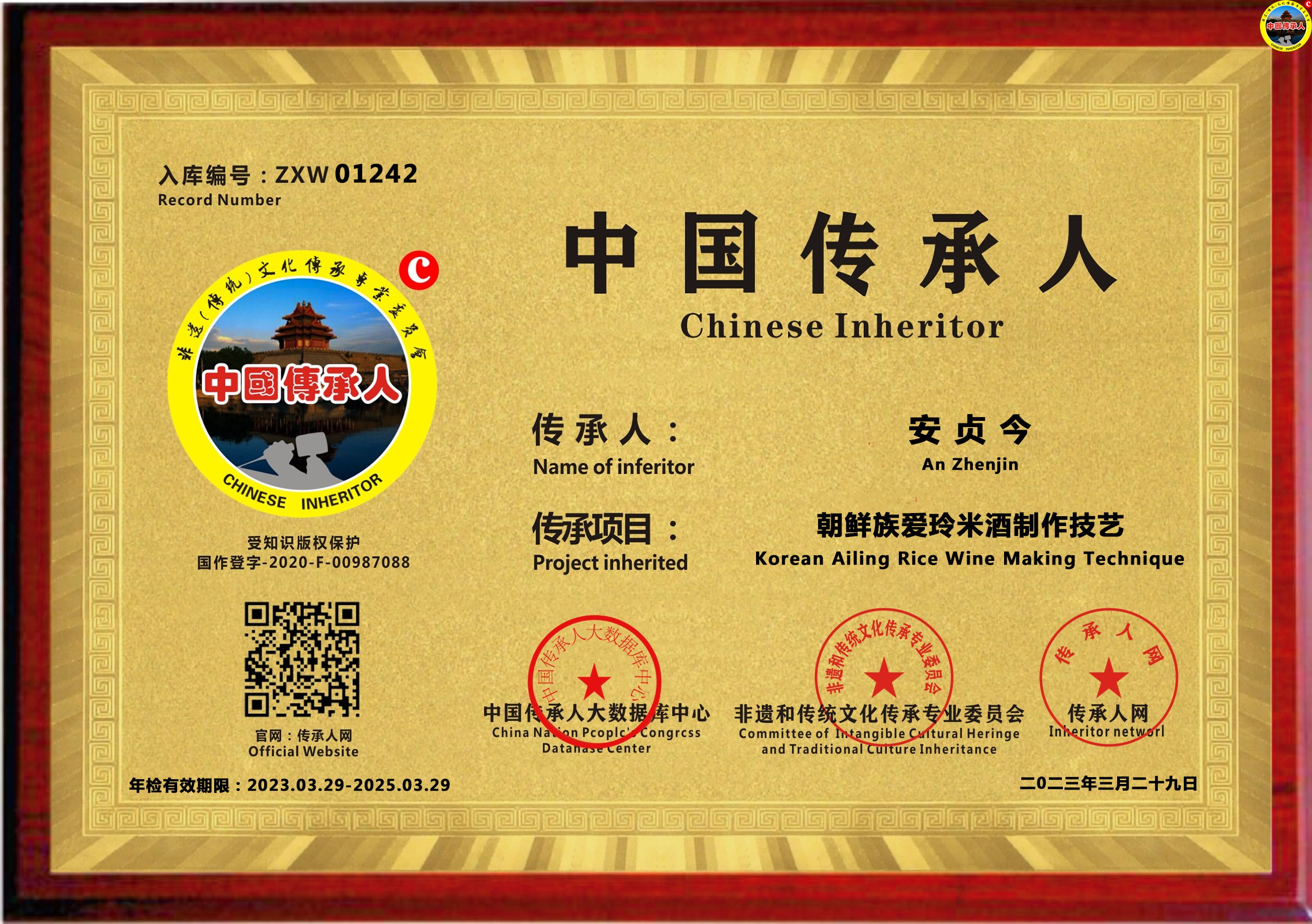 传承人网:2023年4月04日,经中国传承人大数据库中心非遗和传统文化传承专业委员会审核,认为吉林省延吉市安贞今同志申报的“朝鲜族爱玲米酒制作技艺”具有传承价值,符合申报条件,准许入库传承人网《中国传承·人才智库》,并授权使用受国家知识产权局保护的“中国传承人及图”牌证。