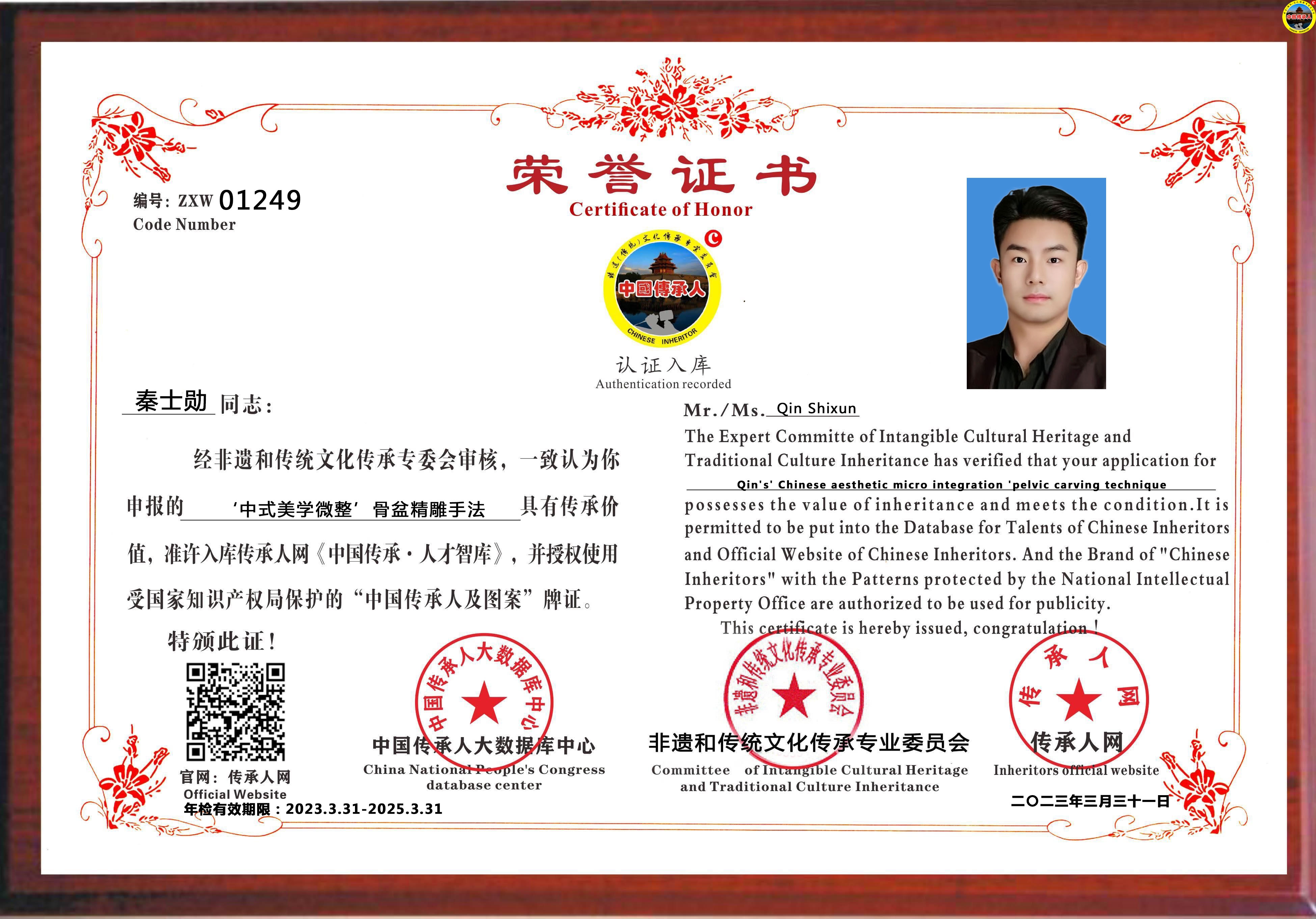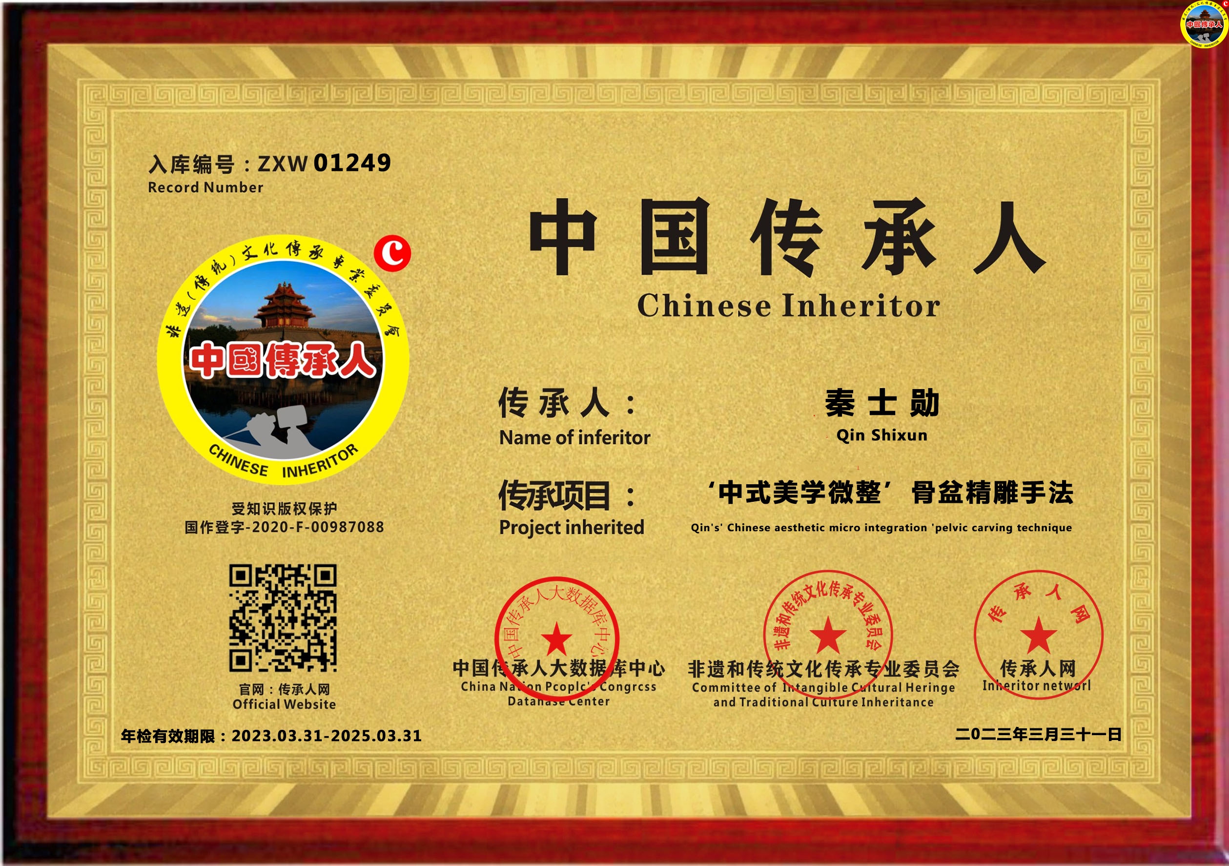 传承人网:2023年4月14日,经中国传承人大数据库中心非遗和传统文化传承专业委员会审核,认为贵州省贵阳市秦士勋同志申报的“‘中式美学微整’骨盆精雕手法”具有传承价值,符合申报条件,准许入库传承人网《中国传承·人才智库》,并授权使用受知识产权保护“中国传承人及图”牌证。