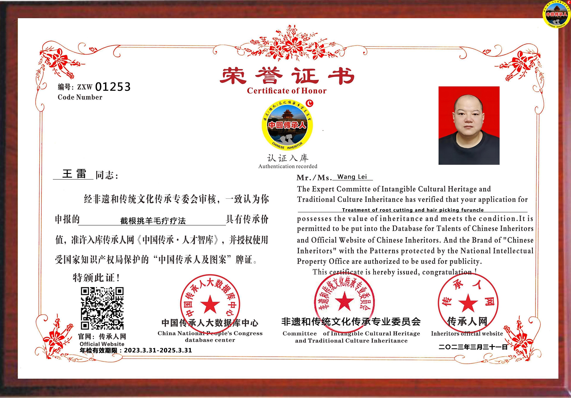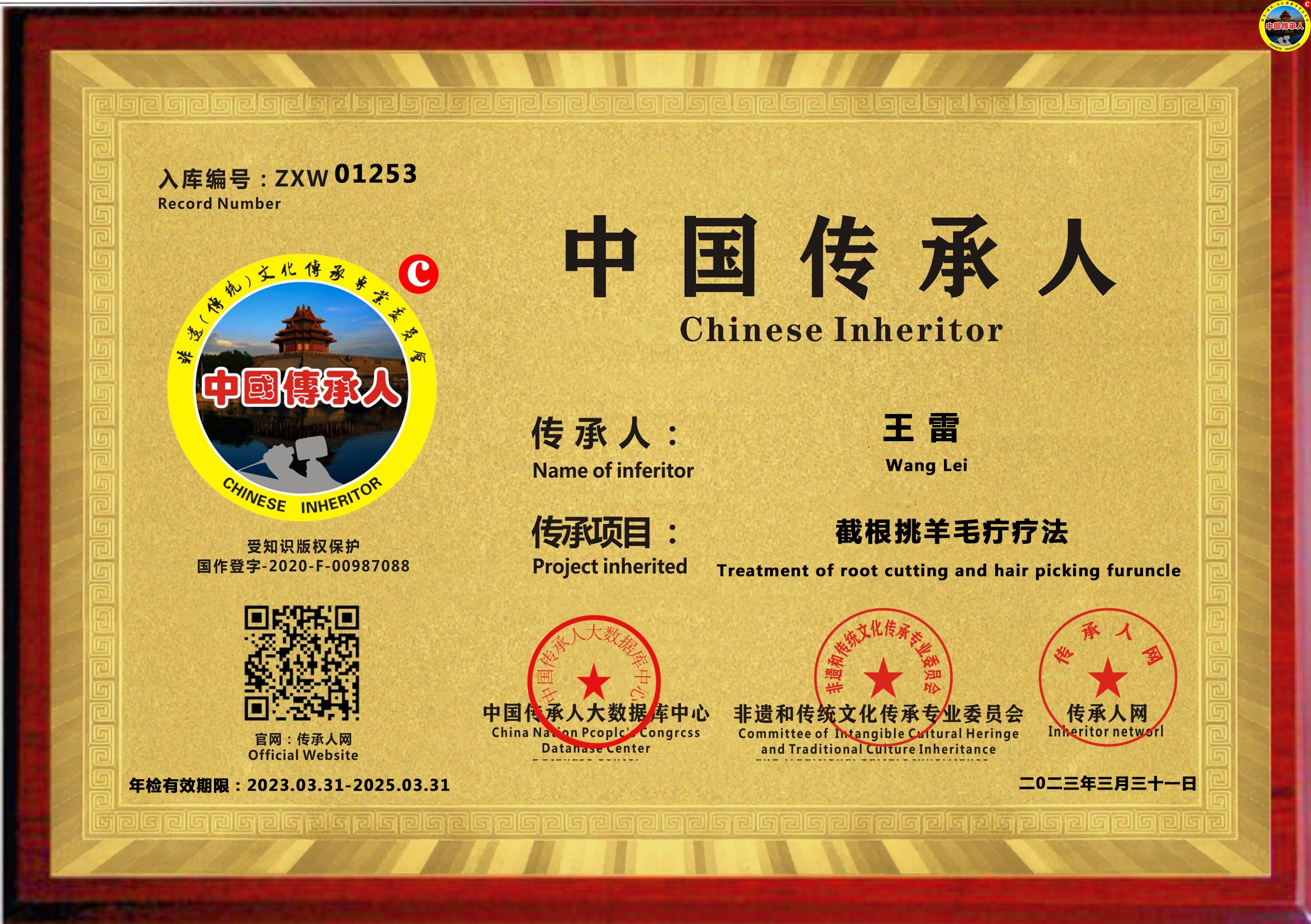 传承人网:2023年04月20日,经中国传承人大数据库中心非遗和传统文化传承专业委员会审核,认为吉林省长春市王雷同志申报的“截根挑羊毛疔疗法”具有传承价值,符合申报条件,准许入库传承人网《中国传承·人才智库》,并授权使用受知识产权保护“中国传承人及图”牌证。
