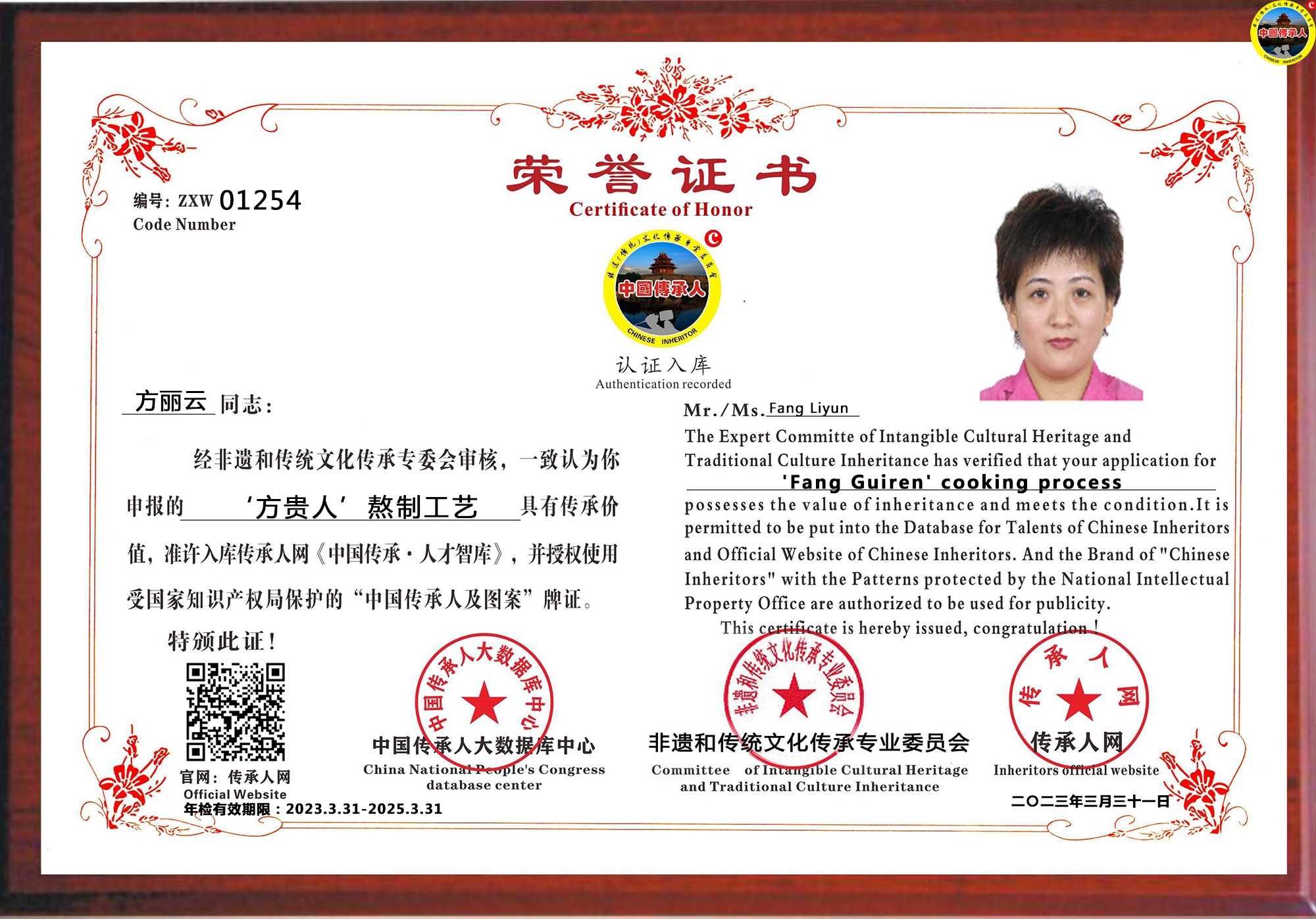 传承人网:2023年4月21日,经中国传承人大数据库中心非遗和传统文化传承专业委员会审核,认为福建省厦门市方丽云同志申报的“‘方贵人’熬制工艺”具有传承价值,符合申报条件,准许入库传承人网《中国传承·人才智库》,并授权使用受知识产权保护“中国传承人及图”牌证。