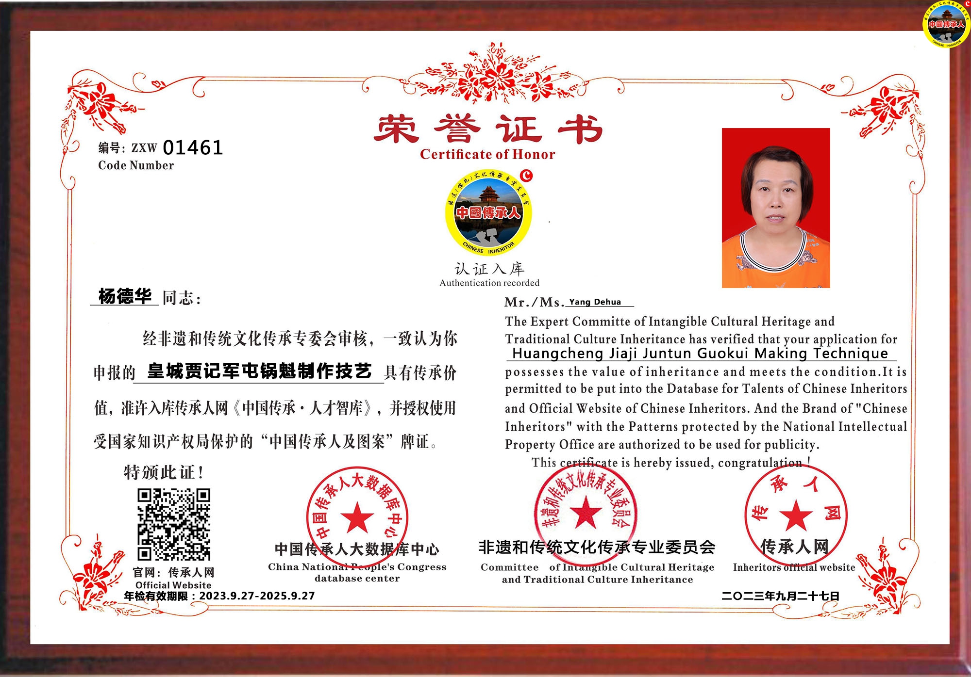 杨德华,网友称呼贾妈妈,汉族,群众。来自于军屯锅魁之乡彭州市军乐镇。她的丈夫于1989年拜非遗传承人为师学到了此门技艺,学成后在彭州市丹景山镇(彭白路关口段)老车站旁摆了一个露天摊位。杨德华对于锅魁有独特的敏感度,结合市场需求将锅魁在原有制作方式上进行创新,做出来的锅魁酥脆化渣,自创的红糖酥锅魁堪称一绝,凭借精湛的技艺战胜市场,成为当地唯一留下来的一家老字号锅魁店。