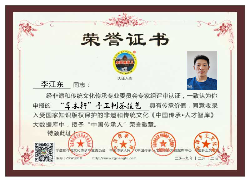 简介: 李江东,生于 1978年12月,广元市苍溪县陵江镇人,现为四川省草木轩茶业有限公司总经理、生产部厂长、茶场场长。在其父亲(高级茶技师苍溪漓江茶驻场指导干部李沛勋,于 60年代考察全县选址建茶园)制茶技艺的熏陶下,把做好茶叶当成自己一生追求的事业,于 1997年专一从事茶叶研学至今。系统学习了多部茶学专著理论,走遍川内名山大川以及部分省外茶区,亲历茶叶一线学习传统制茶技术。理论联系实际重头再学,从茶种植到加工制作、审评学起,边走边学,拜访了多位民间制茶高手、制茶大师、以 及川农茶学专家,探讨学习更高的制茶技艺,融入自己的制茶技术实践中,并形成自己独特的制茶工艺。