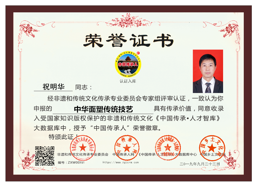 简介:祝明华,男,出生于1977年10月,凉山州盐源县树河镇田湾人,中华面塑传统技艺传承人,明华烹饪艺术培训工作室创始人,高级中式烹调师。祝明华从小一直痴迷于中华面塑技艺,自学刻苦钻研,但成效微乎其微,后来,觉得要赶超时代是远远不够的,便开始辗转各方,仿遍名师。1999年入厨,2003年至2004年在西昌市海兵村自主经营休闲庄。2005年在巴国布衣烹饪学院随中国烹饪大师周学代进修川菜。2009年随中国写实派,糖艺创始人张家清大师深造写实派糖艺,