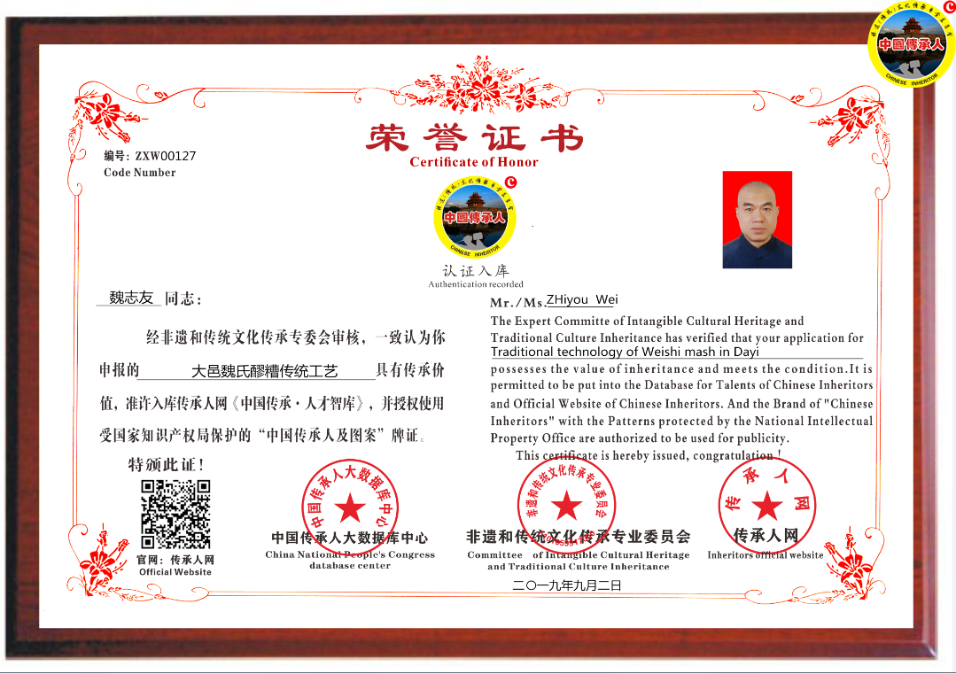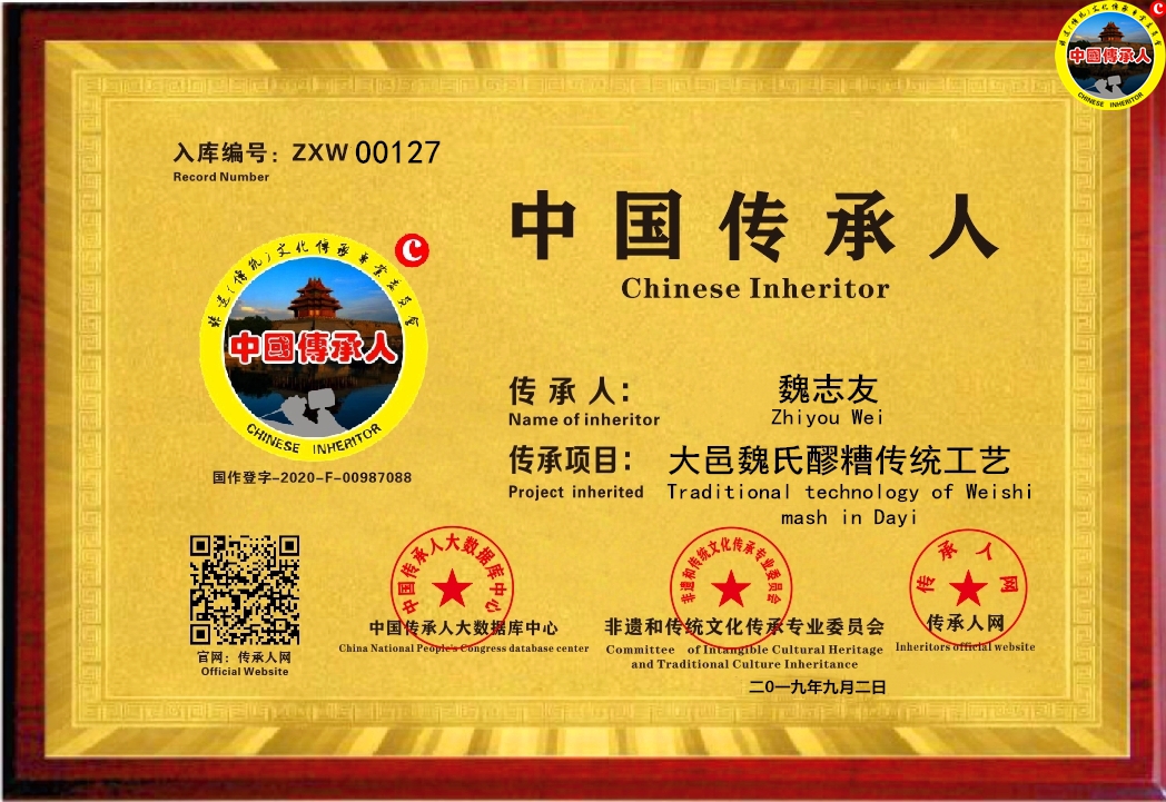 简介:魏志友,1966年4月出生于四川大邑县晋原镇龙华村9组,祖传醪糟传统制作技艺,传承已有100多年。从小随其爷爷、父亲学习制作醪糟,1982年继承父辈醪糟加工坊,进入醪糟生产行业。30多年,严寒酷暑,春夏秋冬,仍坚持以传承工艺制作,只为给百姓制作一口甘甜,健康卫生的传统美食。其制作的甘甜可口,绿色健康的醪糟,受到了众多百姓的认可与喜爱。大邑县本土诗人王国成作诗曰:百年老店魏醪糟--魏家世住下南乡,竹径幽深傍菱塘。醪醴新醅浮素白,亲朋沓至尽飞觞。糟浆满瓮心犹足,花院浓萌日正长。好在百年风雨过,秋来唯愿有丰穰。