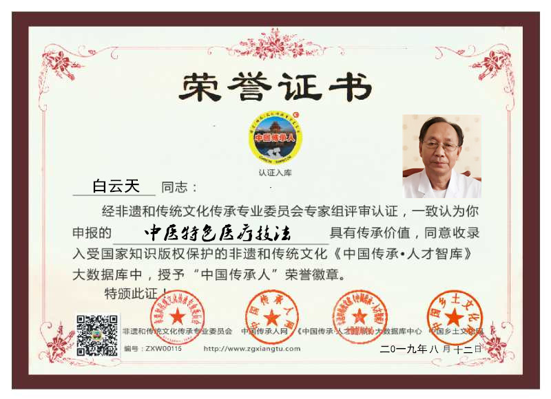 简介:白云天,字炳朝,出生于旺苍中医骨科世医家庭第四代传人,后又师承于绵阳地区名医曾顺之老先生学习中医内科,1982年参加全国医古函授班进修学习。中医执照医师,四川知名老中医,中国基层特色医疗名医,一生苦心钻研医术,多次受到省市行业主管部门的表彰和奖励,多篇医学论文被中国医药科技出版社的中国特色医疗临床经验优秀文集发表刊载,2006年荣获中国基层特色医疗名医称号。