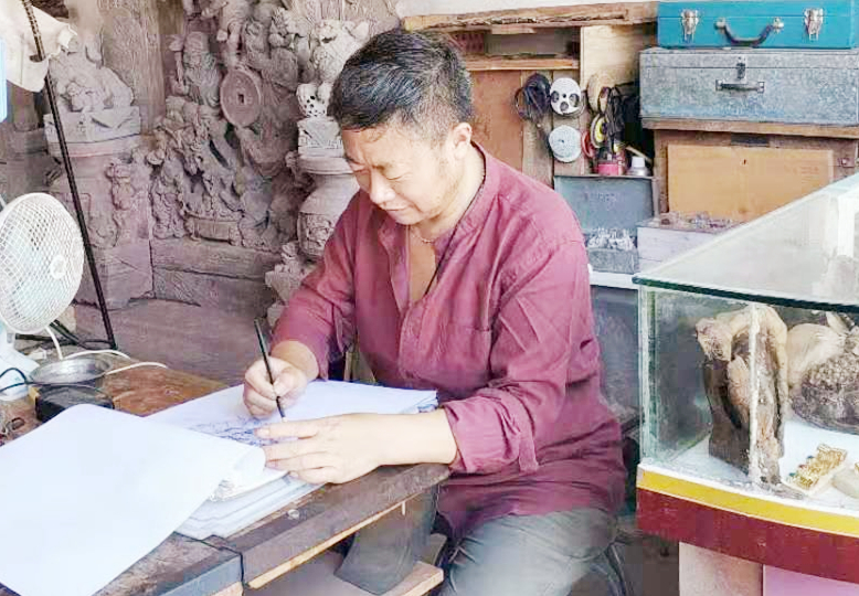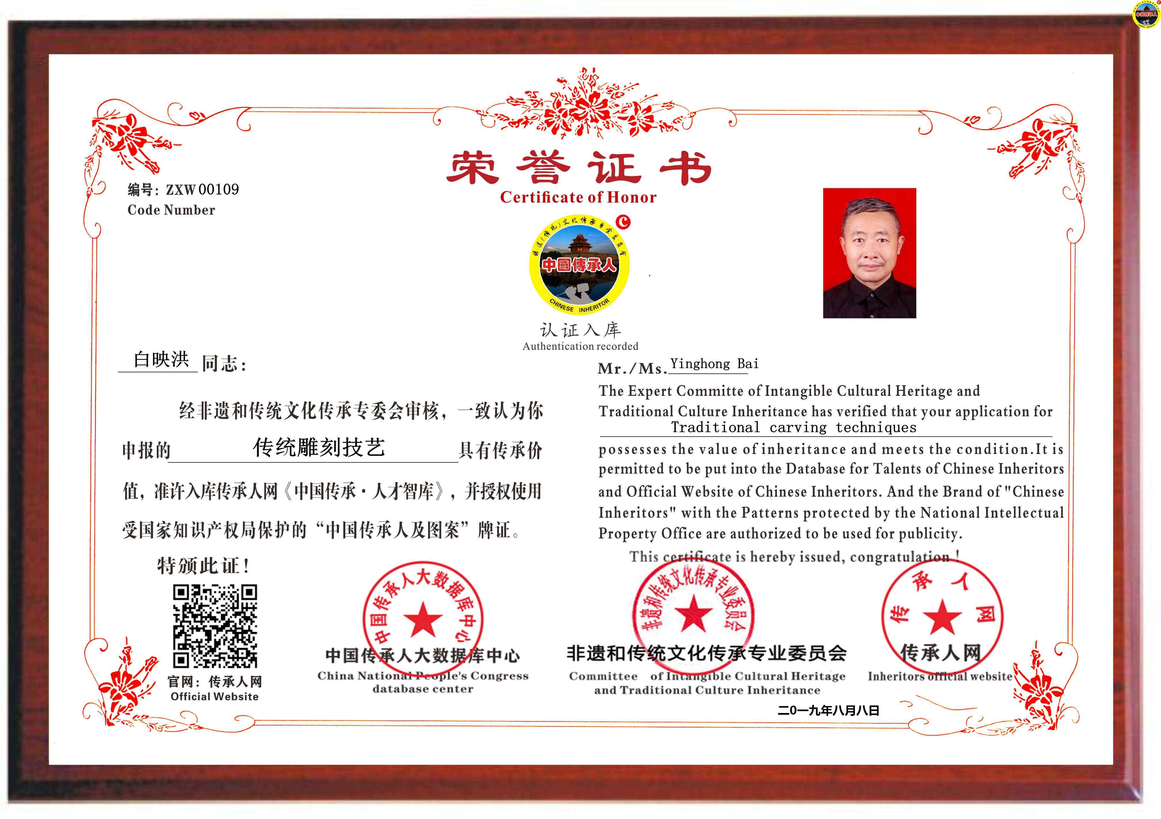 简介:白映洪,男,出生于1963年4月,邛崃水口人。高中毕业后,1984-1987年,白映洪投身教育事业,在水口小学从教3年。1987年,拜师于陈良因先生门下,学习丹青。1990年,投入社会,独身闯荡。为求谋生,开始制作工艺品,包含:牌匾、屏风、油画、碳精肖像画等。同时也穿梭于大小庙宇,为其制作泥塑、石雕佛像。后又受邀于诸多石雕碑场做石刻制作。这段时间沉淀了不少作品,其中名为《八仙过海》、《二十四孝图》的碑梁雕刻以及为鹤林寺制作的罗汉、观音石刻等作品尤其受百姓喜爱。