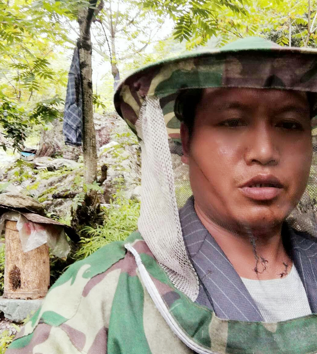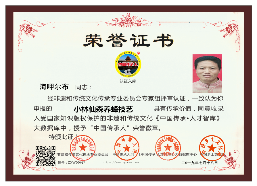 海呷尔布,彝族,生于1971年3月,现年48岁,出生于凉山北大门甘洛县阿兹觉乡吉老彝各村,自幼跟随父亲养蜂、牧羊,海呷尔布,自幼跟随父亲乃乃以日在海拔1000多米的深山老林中养蜂、采蜜、牧羊,耳濡目染让他自幼便熟练掌握了古法养蜂技艺,如今独自管理着300多桶蜂,每年蜂蜜产出比都高于当地其他养蜂人,他也因此成了这一带的养殖名人和养殖大户。