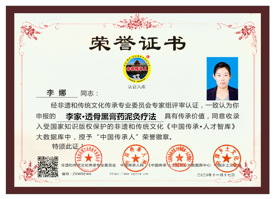 简介:李娜,出生于1984年10月,山东省临沂市人,李家·透骨黑膏药泥灸疗法传承人,李家膏药老铺第十四代传承人,毕业于山东中医药大学。李娜出生于中医药世家,家族世代行医救人,李娜出生于改革开放之后,稳定的社会环境,浓厚的家族医学氛围,使得李娜自小就对中医药非常感兴趣,在她提出想要学习的想法时,家里人都非常支持她,希望她能将家族医学继续传承和发扬下去,因此李娜报考了山东中医药大学,大学毕业之后家里长辈便将家族传承三百多年的李家医林堂的医术医方,尤其对于家族非常重要李家·透骨黑膏药泥灸疗法,自此她成为了李家膏药老铺第十四代传承人。