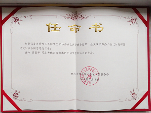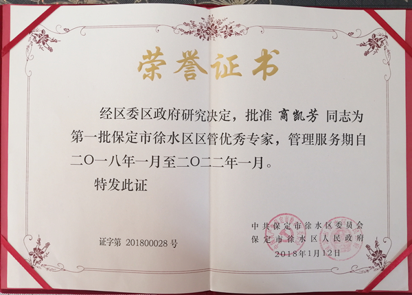 2018年初荣获《保定市徐水区首批优秀行业专家》称号。