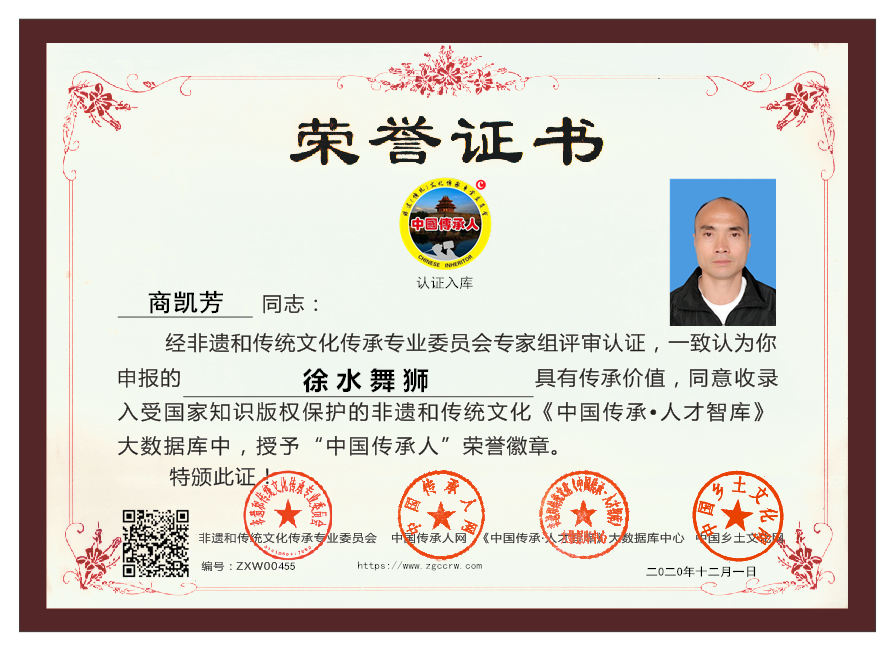 传承人网:2020年12月01日,经非遗和传统文化传承专委会召开专家组评审会议,一致认同河北省保定市商凯芳同志申报的“徐水舞狮”具有传承价值,符合申报条件,准许入库传承人网《中国传承·人才智库》,并授权使用受知识产权保护的“中国传承人及图”牌证。