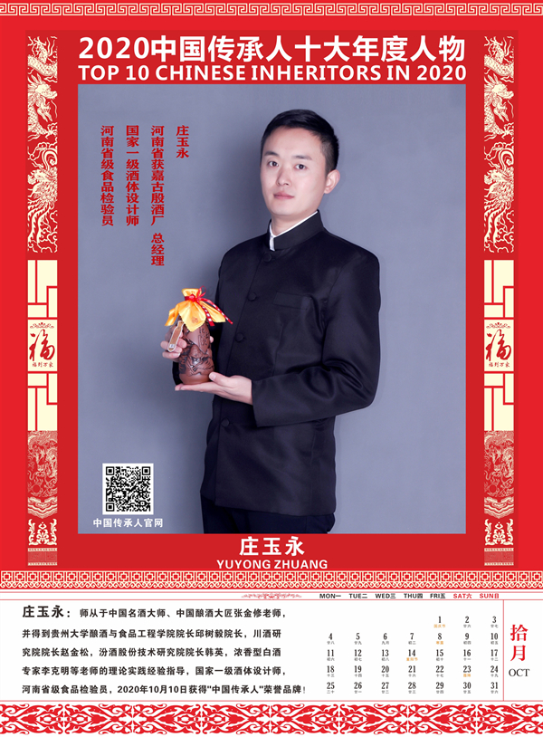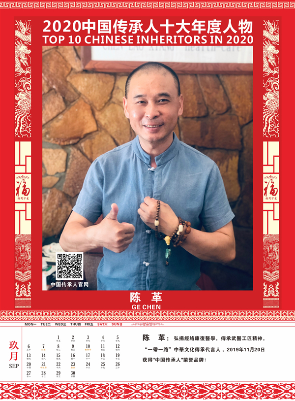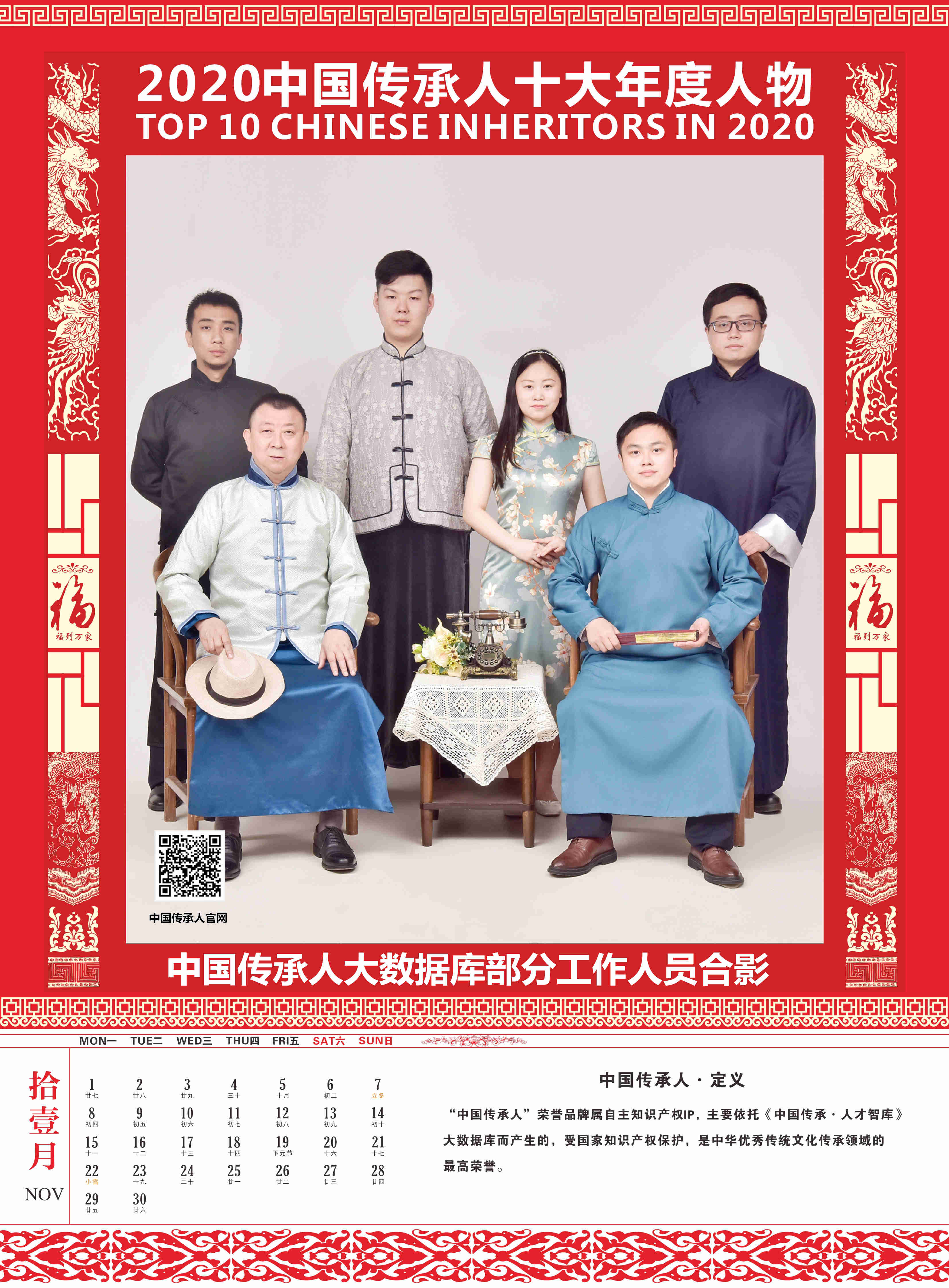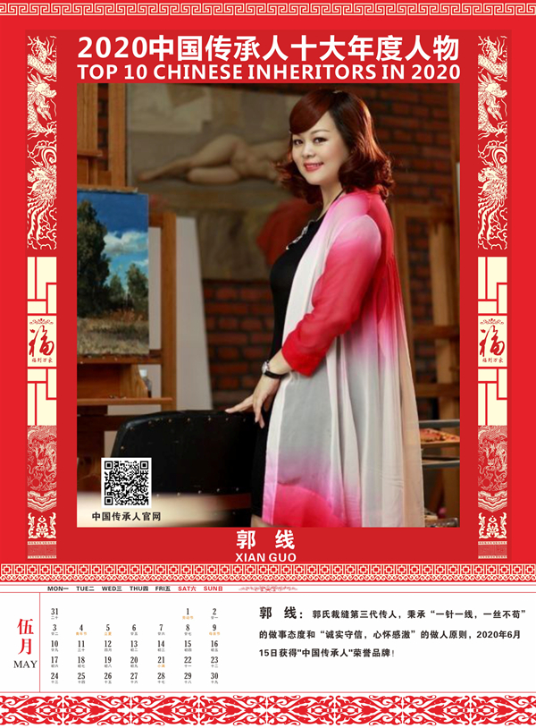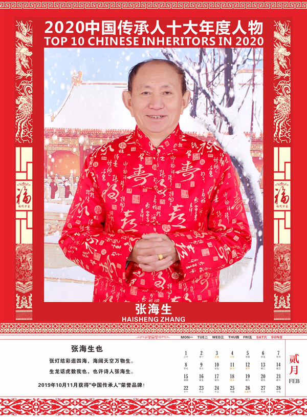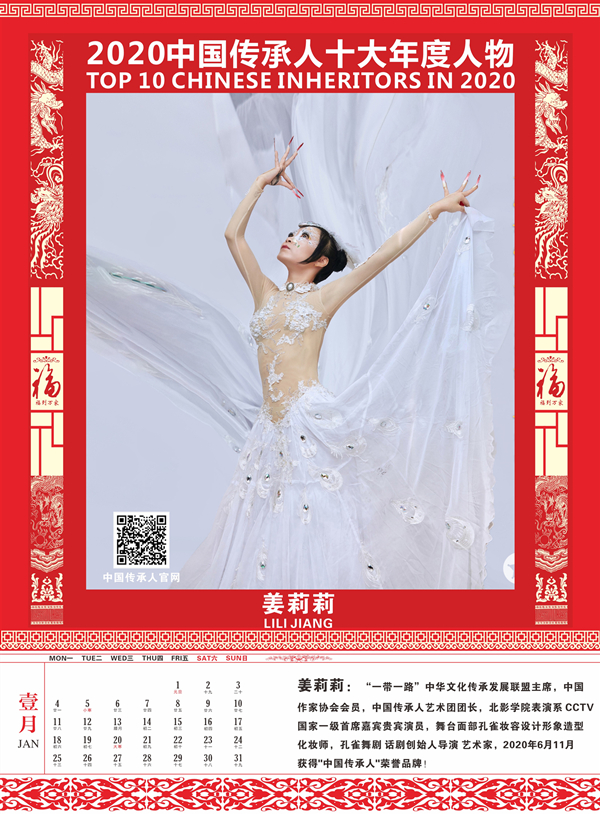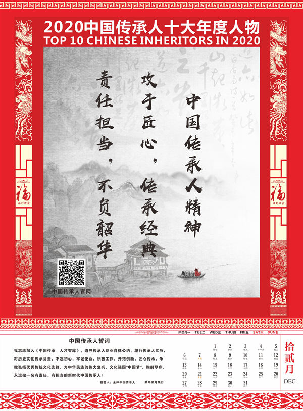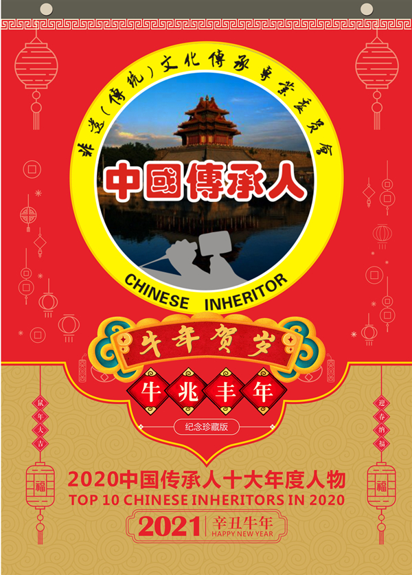 传承人网讯:2020年9月30日,由中国传承人大数据库推荐50名优秀中国传承人参加网络评选活动,经过一个多月的网络公众投票评选出15名候选人,再经专家组认真评审,最终认定中国传承人姜莉莉、张海生、王广桥、张丁月、郭线、王勇刚、张萍、张金修、陈革、庄玉永十位同志符合评选条件,特授予“2020中国传承人十大年度人物”荣誉称号,为扩大其社会影响力,特定制“2021纪念收藏版挂历”,大力宣传推广他们的获奖荣誉!