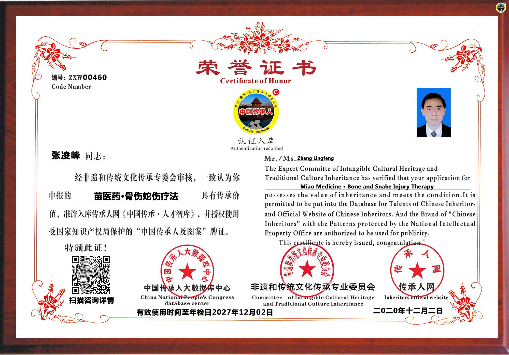 传承人网:2020年12月02日,贵州省贵安新区张凌峰同志申报的“苗医药·骨伤蛇伤疗法”具有化传承价值,准许入库传承人网《中国传承·人才智库》,并授权使用受知识产权保护“中国传承人及图”牌证。
