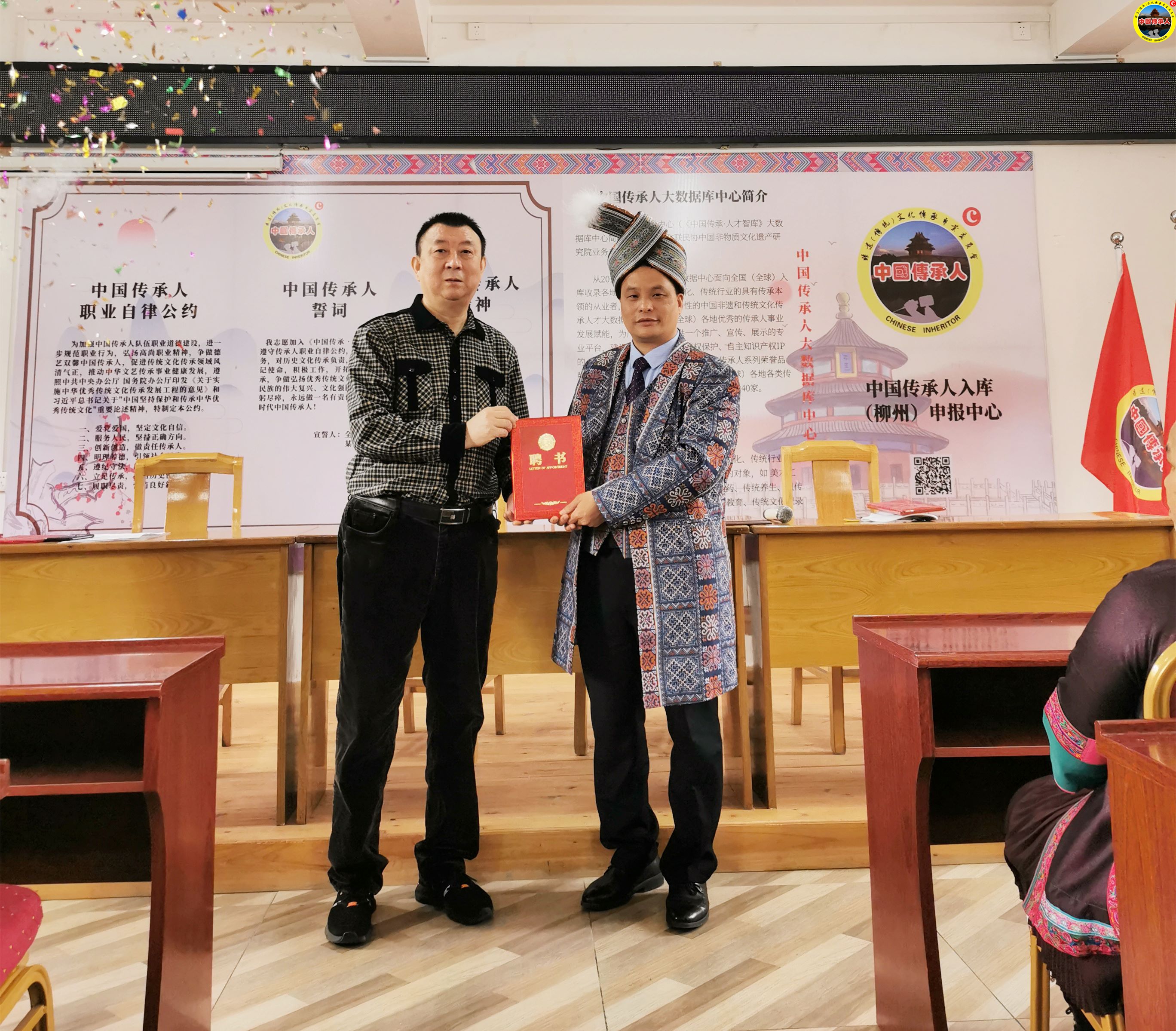 中国传承人大数据库中心主任潘辉向柳州申报中心领导班子成员颁发荣誉证书,中国传承人(广西·柳州)申报中心的正式成立,让苗侗壮医传承人倍感骄傲和自豪。