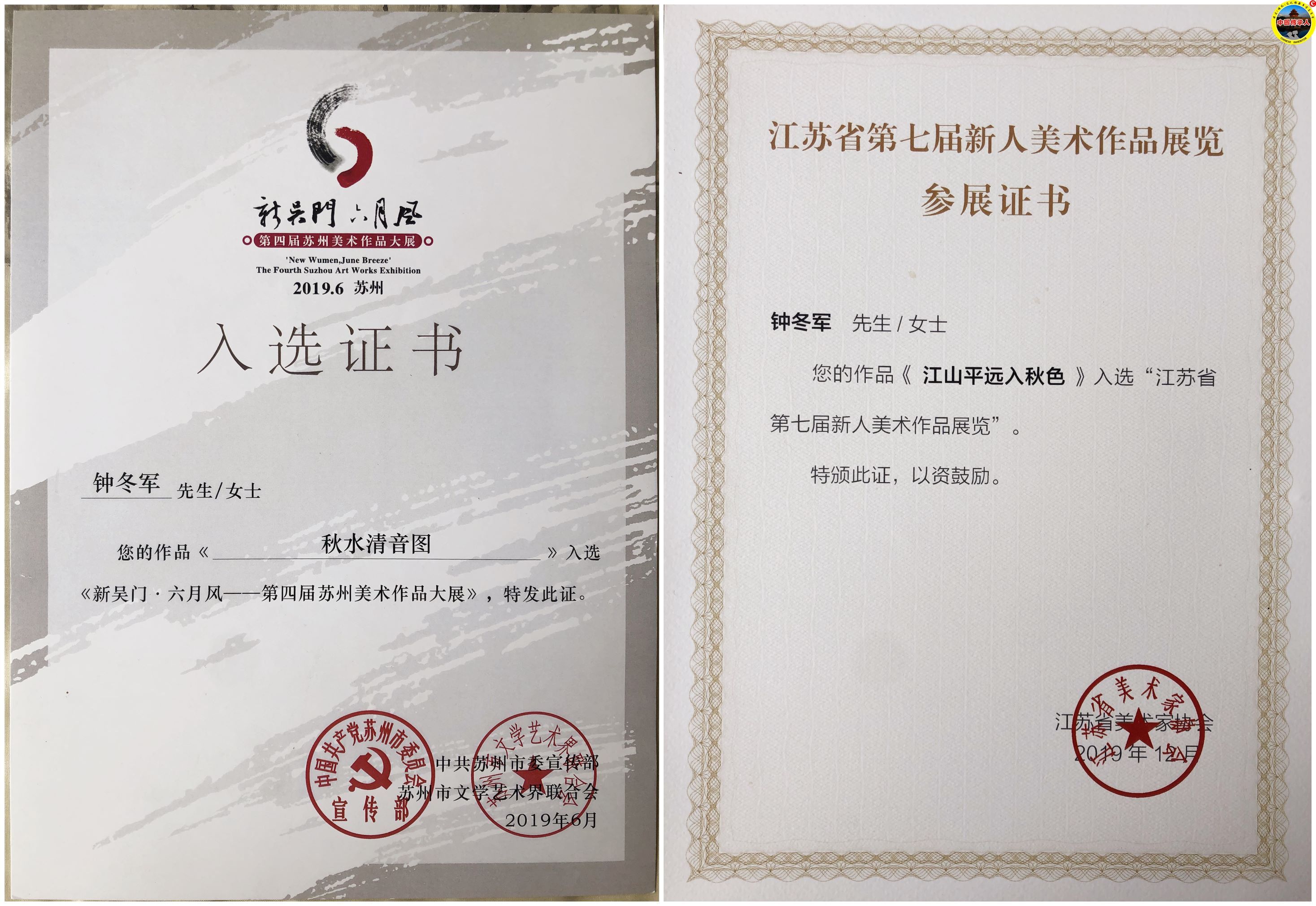 2018年8月,其作品《云溪秋水图》入选中国(龙岩)生态龙岩红色闽西中国画作品展;2018年12月,其作品《秋水清言》入选“汉风唐韵·水墨长安”全国中国画作品展;2019年6月,其作品《秋水清言图》入选《新吴门·六月风第四届苏州美术作品大展》;2019年12月其作品《江山平远入秋色》入选“江苏省第七届新人美术作品展览”。