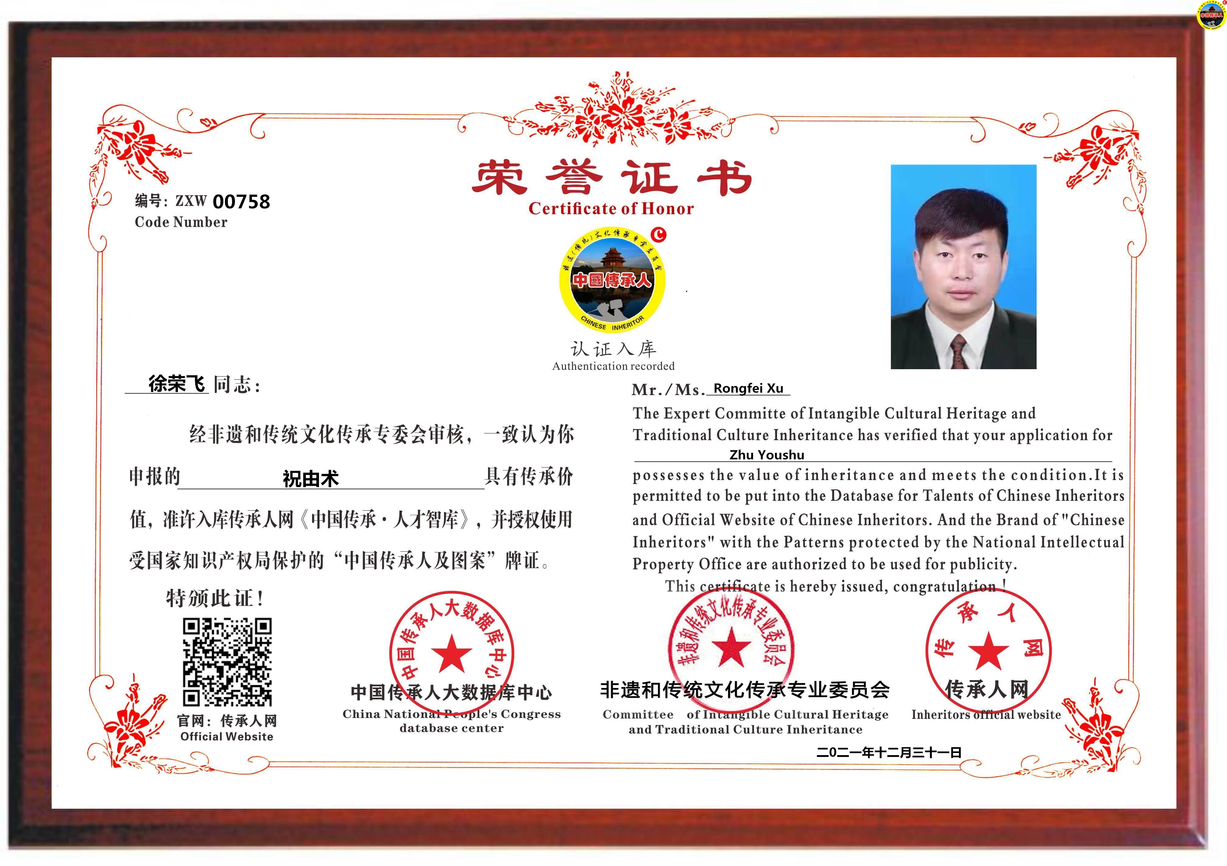 徐荣飞,男,1976年出生,江苏省盐城市人,道号:高生,全真龙门派第二十七代弟子。因其自幼酷爱玄学,2006年开始拜师学艺(祝由、风水、数术、道法)。祝由术在古代又被称为巫术,是一项崇高的职业,它曾经是轩辕黄帝所赐的一个官名。当时能施行祝由之术的都是一些文化层次较高的人,他们都十分的受人尊敬。 祝由术是包括中草药在内的,借符咒禁禳来治疗疾病的一种方法。“祝”者咒也,“由”者病的原由也。本法在中国广为流传.多由师傅带徒弟的方法,口传心授。徐荣飞因机缘巧合,跟随胡一鸣大师亲传弟子黄传恩先生学习阴阳法风水。后通过黄传恩先生的举荐,又师从祝由术传承人王晓岳先生(字辈:京岳),得其真传。
