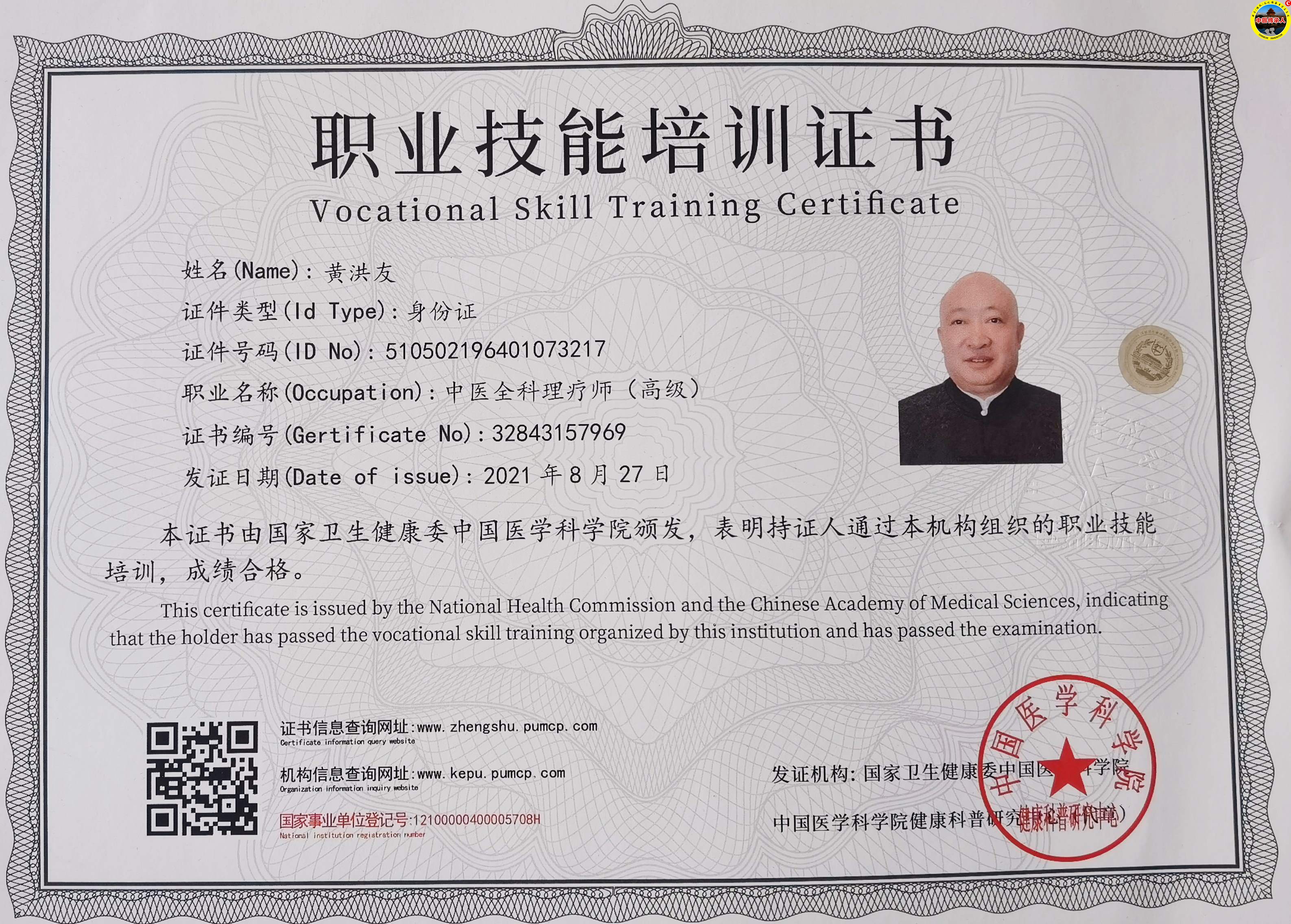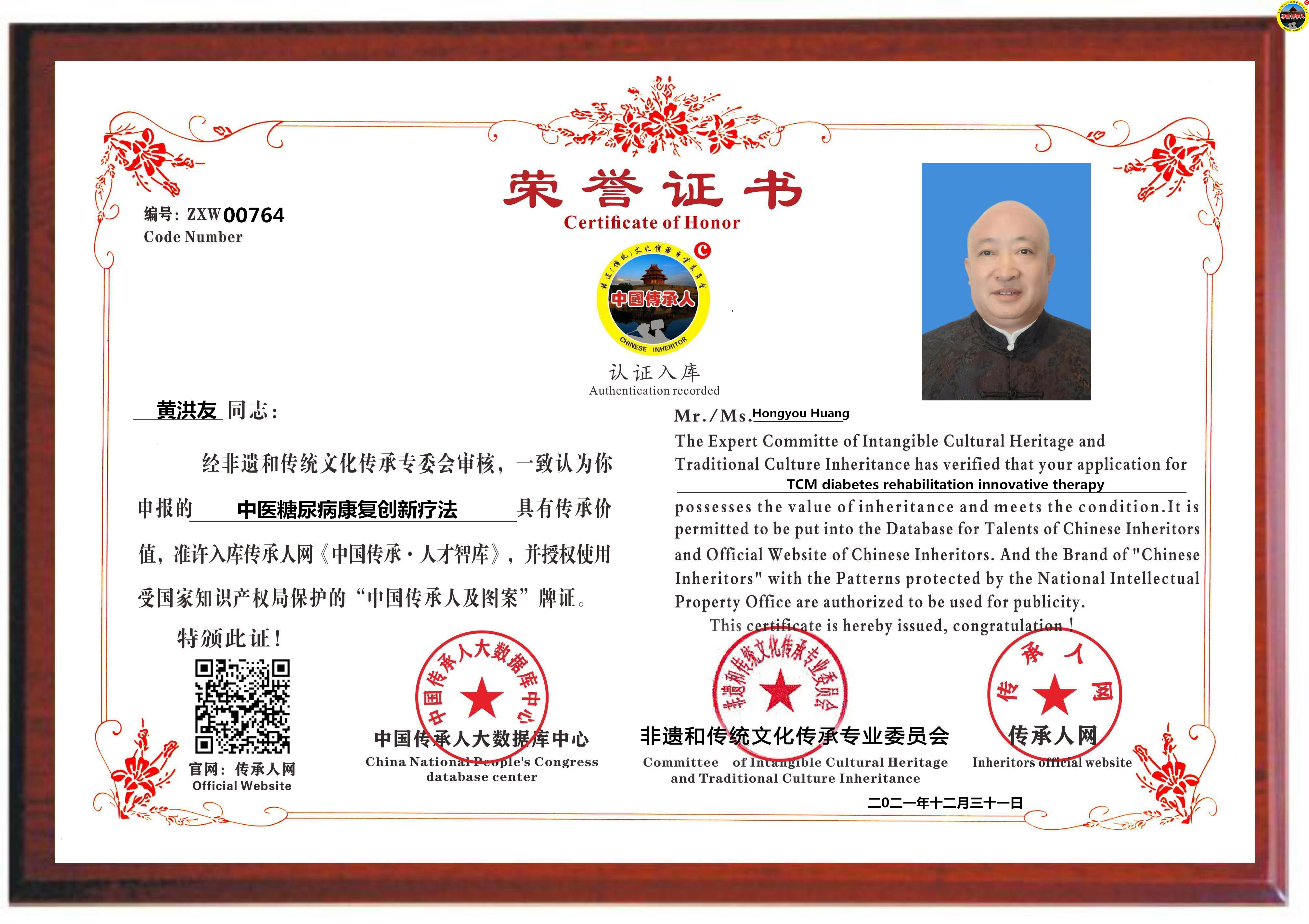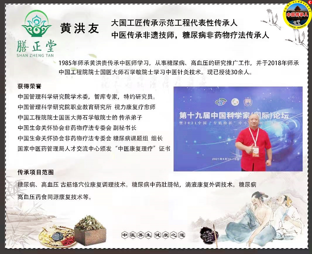 黄洪友,四川泸州人,1982年应征入伍,1985年退伍回乡,继承家传中医药事业,师承黄洪贵中医师学习糖尿病、高血压的经络调理等,并于2018年师承中国工程院院士国医大师石学敏院士,学习中医针灸技术,他长期致力于糖尿病、高血压的经络调理,中药外调,药食同源特色创新疗法的调理康复研究工作。